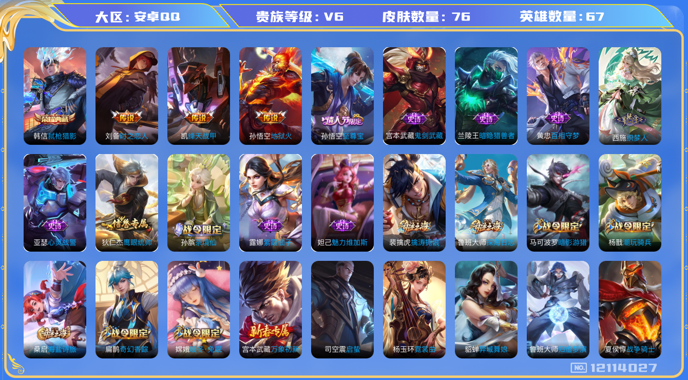 - PX_2091313-贵族7/皮肤234/传说11/史诗63/英雄123/曜器灵螭龙剑/蔷薇恋人/特工战影/胖达荣荣/时之恋人男/一念神魔/炽阳神光/末日机甲策/无双飞将/山海炽霜斩/逐花归海/桑启鸣野蒿/云缨幻光神枪/澜愿照九州拓/姜子牙天穹之誓/李白谪仙醉月/狄仁杰阴阳师/赵云皇家上将/蔷薇恋人/钟无艳王者之锤/钟无艳超时空战士/甄姬落雪兰心/岱宗/暗影游猎/山海玄木吟/狄仁杰魔术师/项羽海滩