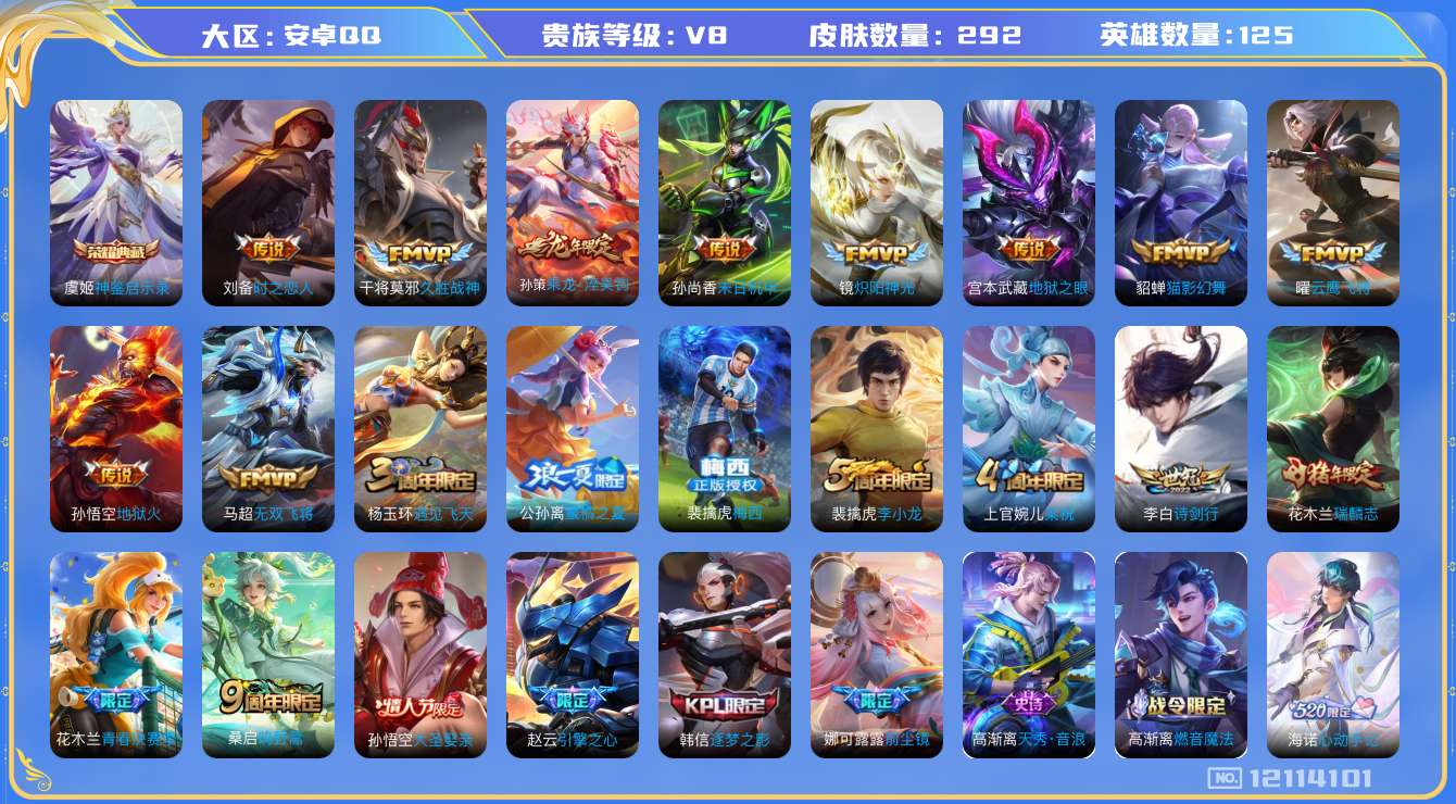 [12114101]V8 1典藏 14传说 125英雄 292皮肤 可修改实名 优质装备:神鉴启示录,云鹰飞将(小将军),猫影幻舞,久胜战神,炽阳神光,末日机甲-孙尚香(绿蚂蚱),地狱火,地狱之眼,时之恋人-刘备(电焊工),无双飞将 传说皮:乘龙·淬吴钩(孙策年限) 珍宝阁皮:胡桃夹子,万物之道,玩趣恶龙 限定皮:鸣野蒿,梅西,前尘镜,瑞麟志(木兰年限),遇见飞天,诗剑行,梁祝,李小龙,逐梦之影,大圣娶亲,引擎之心,青春决赛季,蜜橘之夏 史诗皮:星界战将,东方月初,海诺心动手记,上官婉儿群星魔术团,蔬乡物语(鲁班七号),星界特工,紫霞仙子,苍穹之光,电玩小子(小书包),白龙吟,黄金分割率,特工魅影,千年之狐,江河有灵,魅语,百解令(蒙犽),高渐离燃音魔法,蒙恬荣光圣徽,偶像歌手,晚萤,百相守梦(刘备),暗夜猫娘,龙骑士(小龙虾),末日机甲-吕布,猫狗日记-孙策,乱世虎臣,节奏热浪,修罗,女仆咖啡,水果甜心,天才门将,星夜王子,心灵骇客,功夫厨神,德古拉伯爵,暗隐猎兽者,幽灵船长,鬼剑武藏,暗渊魔法,心灵战警,天秀·启明,地狱岩魂,纤云弄巧,繁星吟游(呼啦呼啦),拒霜思,乘风破浪,逐浪之夏,水晶猎龙者,曙光守护者,唤灵魅影,金属风暴,原初追逐者,圣诞狂欢,圣诞恋歌,鹰眼统帅,暗夜贵公子,黎明之约,赏金猎手,天秀·音浪,无心