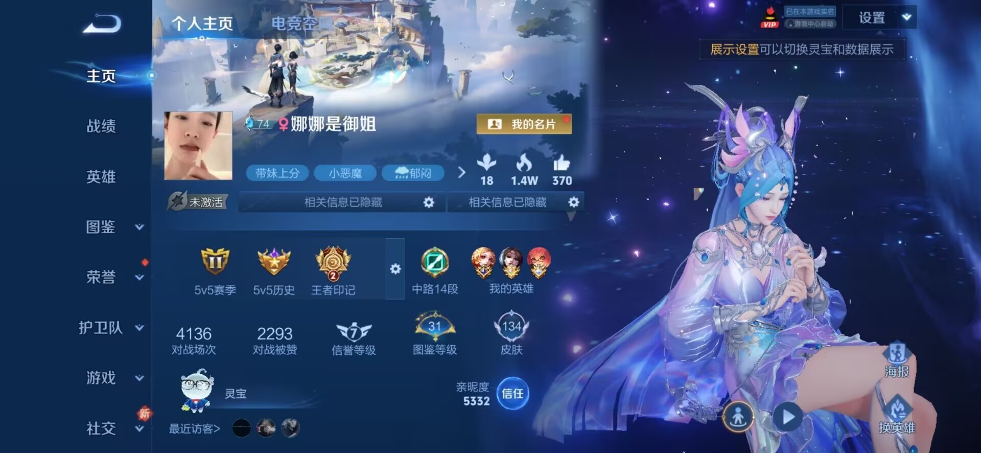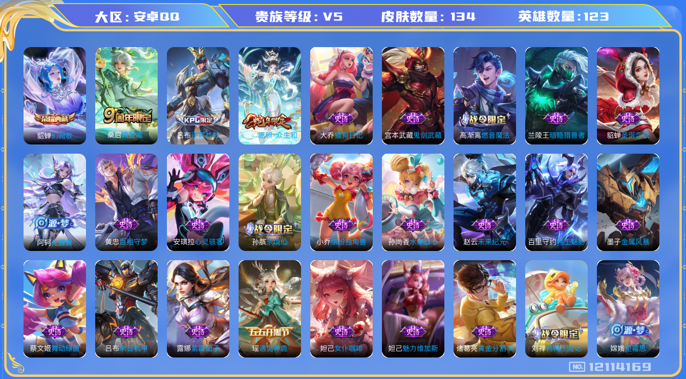 [12114169]V5 1典藏 2传说 123英雄 134皮肤 可修改实名 优质装备:幻阙歌(貂蝉典藏) 珍宝阁皮:女武神 限定皮:愿照·众生和(妲己年限),逐霄战戟,鸣野蒿 史诗皮:鸭鸭历险记-刘禅,化蝶舞,龙之律动,茶境仙,百相守梦-黄忠,遇见神鹿,紫霞仙子,黄金分割率,特工魅影,高渐离燃音魔法,末日机甲-吕布,猫狗日记-大乔,女仆咖啡,水果甜心,天才门将,心灵骇客,暗隐猎兽者,鬼剑武藏,舞动绿茵,拒霜思,缤纷独角兽,金属风暴,圣诞恋歌,魅力维加斯,未来纪元-赵云