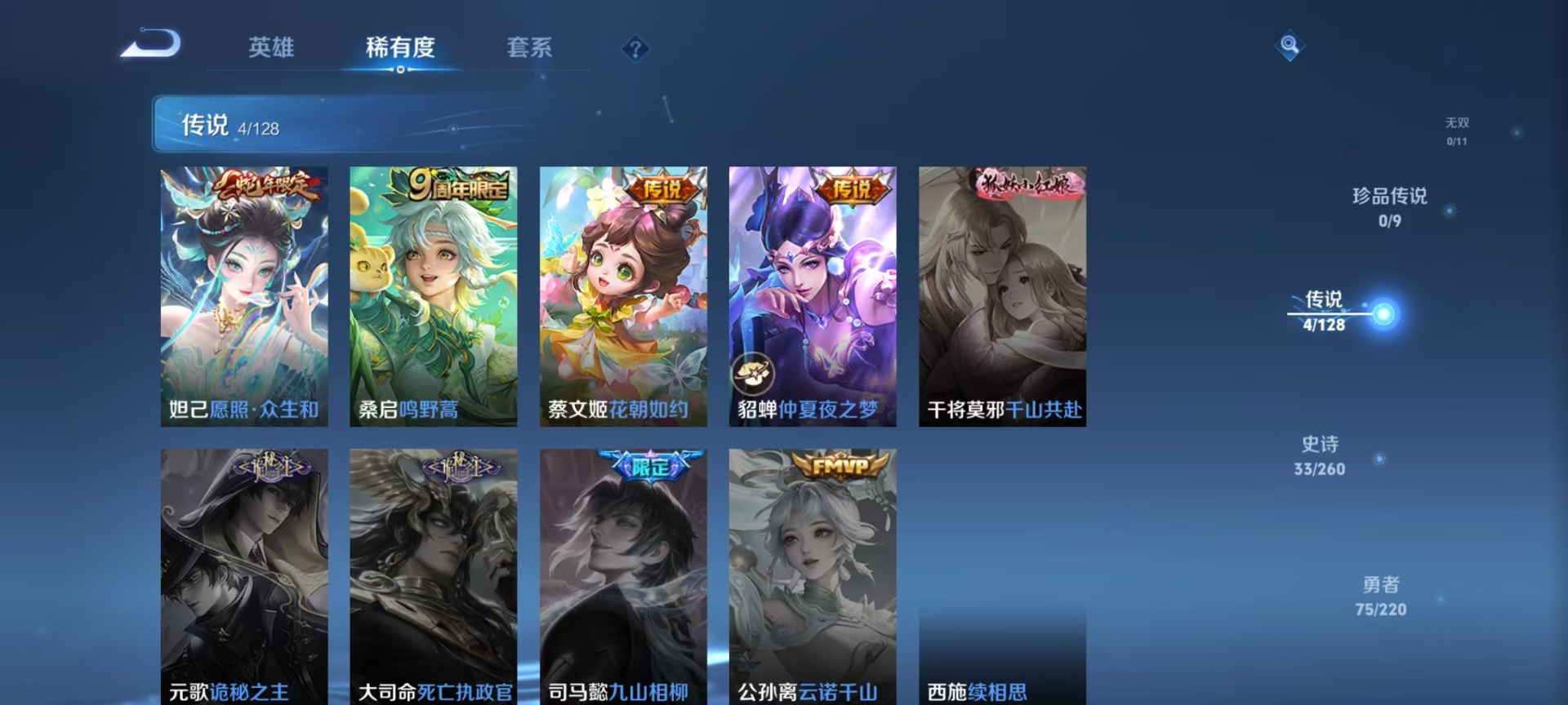 - PX_2103162-Q/荣耀黄金/189皮肤/122英雄/0典藏/0珍品无双/0无双/0珍品传说/12传说/51史诗/8稀有英雄 【12 传说皮肤】地狱火 孙悟空,浮生妄 夏洛特,音你心动 周瑜,黄金射手座 后羿,怒海麟威 吕布,时之恋人 刘备,黄金狮子座 达摩,山海·炽霜斩 李信,一念神魔 李信,画中仙 干将莫邪,黄金白羊座 张良,曦玄引 貂蝉, 【51 史诗皮肤】超元猎域 百里玄策,乘龙·忆