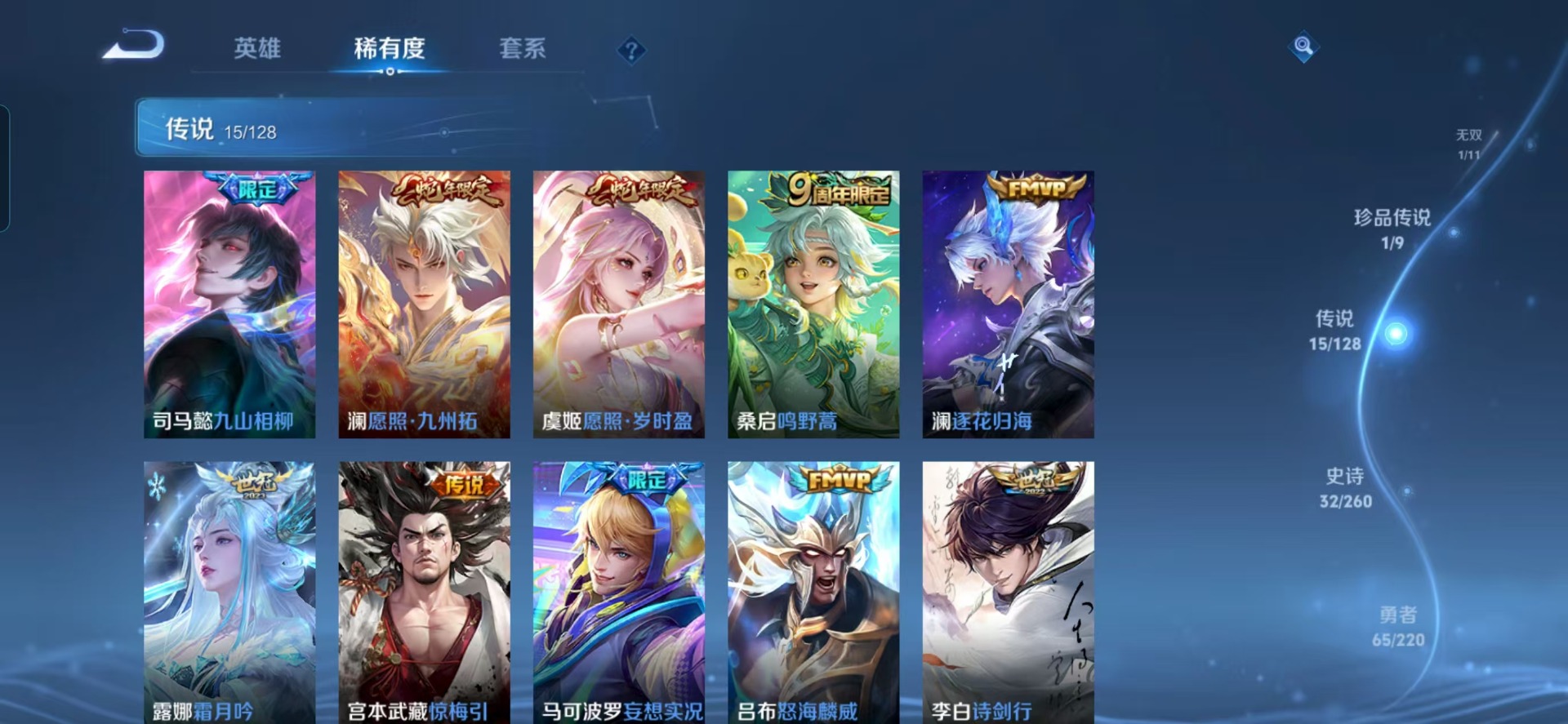 - PX_2077427-93 安卓QQ/至尊星耀/198皮肤/124英雄/1典藏/0珍品无双/0无双/1珍品传说/11传说/51史诗/8稀有英雄 【1 珍品传说】怪盗基德 马可波罗, 【1 典藏皮肤】赤影疾锋 关羽, 【11 传说皮肤】逐花归海 澜,云鹰飞将 曜,遇见神鼓 吕布,寅虎·瑞焰 鲁班七号,乘龙·淬吴钩 孙策,战鼓燎原 典韦,淬星耀世 赵云,寅虎·赤拳 裴擒虎,黄金白羊座 张良,愿照·九州