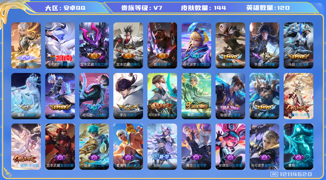 [12114620]V7 1无双 1珍品传说 15传说 120英雄 144皮肤 可修改实名 优质装备:器灵·螭龙剑,怪盗基德,云鹰飞将(小将军),绛天战甲(鸡嘴战神),一念神魔,地狱之眼,无双飞将,妄想实况,惊梅引,霜月吟,澜逐花归海 传说皮:九山相柳 限定皮:愿照·九州拓(澜年限),愿照·岁时盈(虞姬年限),鸣野蒿,至尊宝,诗剑行,怒海麟威,山海·玄木吟(马可年限) 史诗皮:鸭鸭历险记-刘禅,化蝶舞,星界战将,百相守梦-周瑜,茶境仙,破空之剑,百相守梦-百里守约,星界特工,百相守梦-黄忠,织梦人,特工魅影,青蛇,猫狗日记-孙策,时之恋人-孙尚香,乱世虎臣,水果甜心,心灵骇客,幽灵船长,鬼剑武藏,暗渊魔法,心灵战警,舞动绿茵,地狱岩魂,乘风破浪,箭羽风息,鹰眼统帅,魅力维加斯