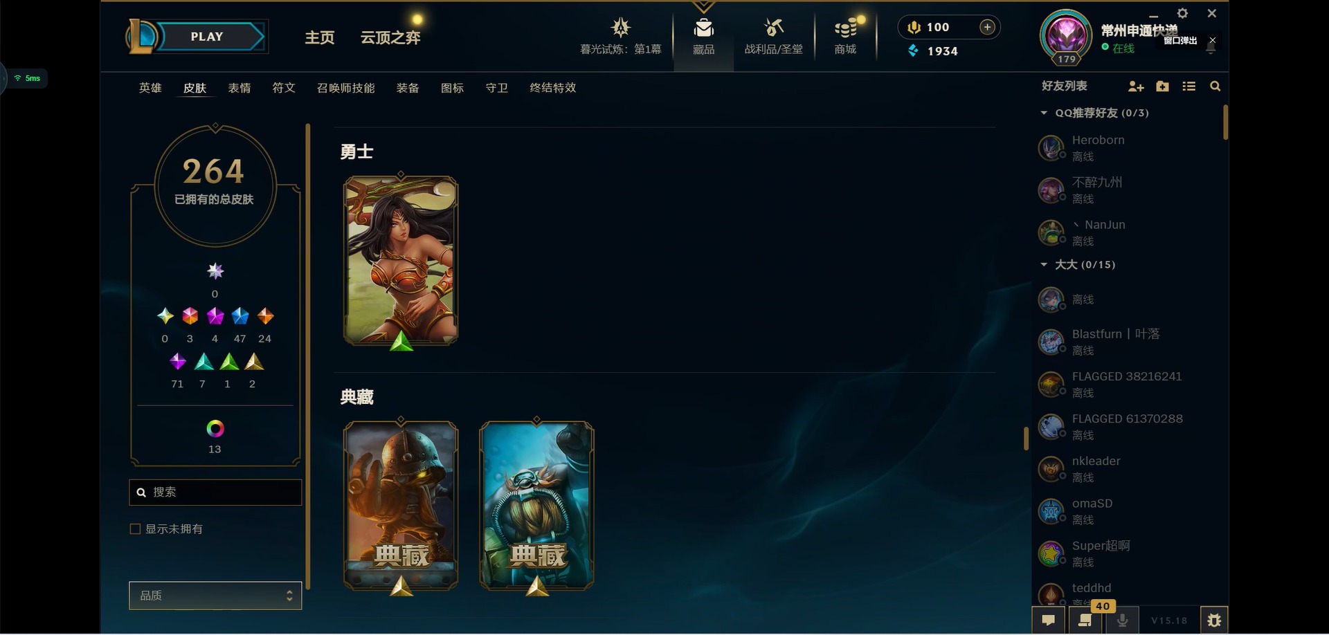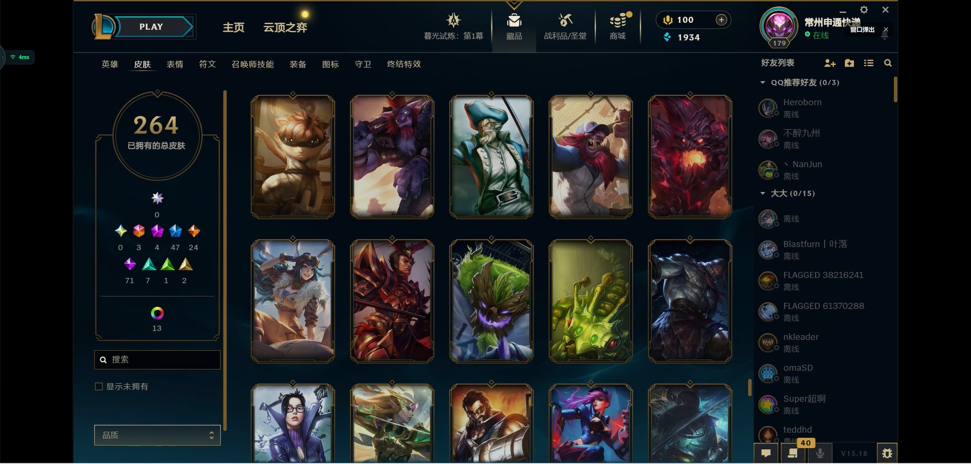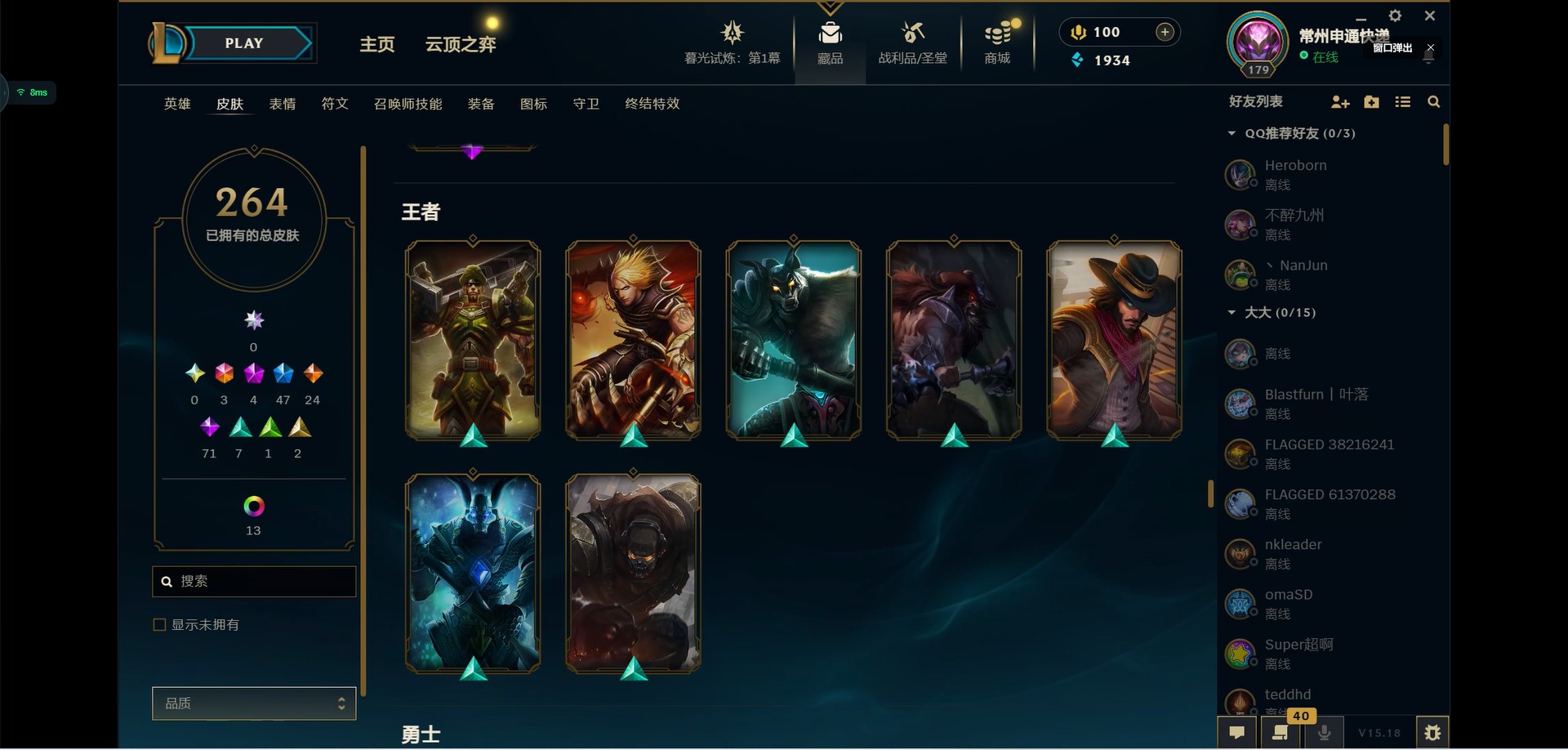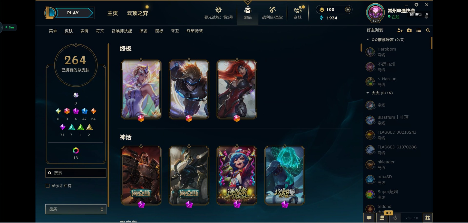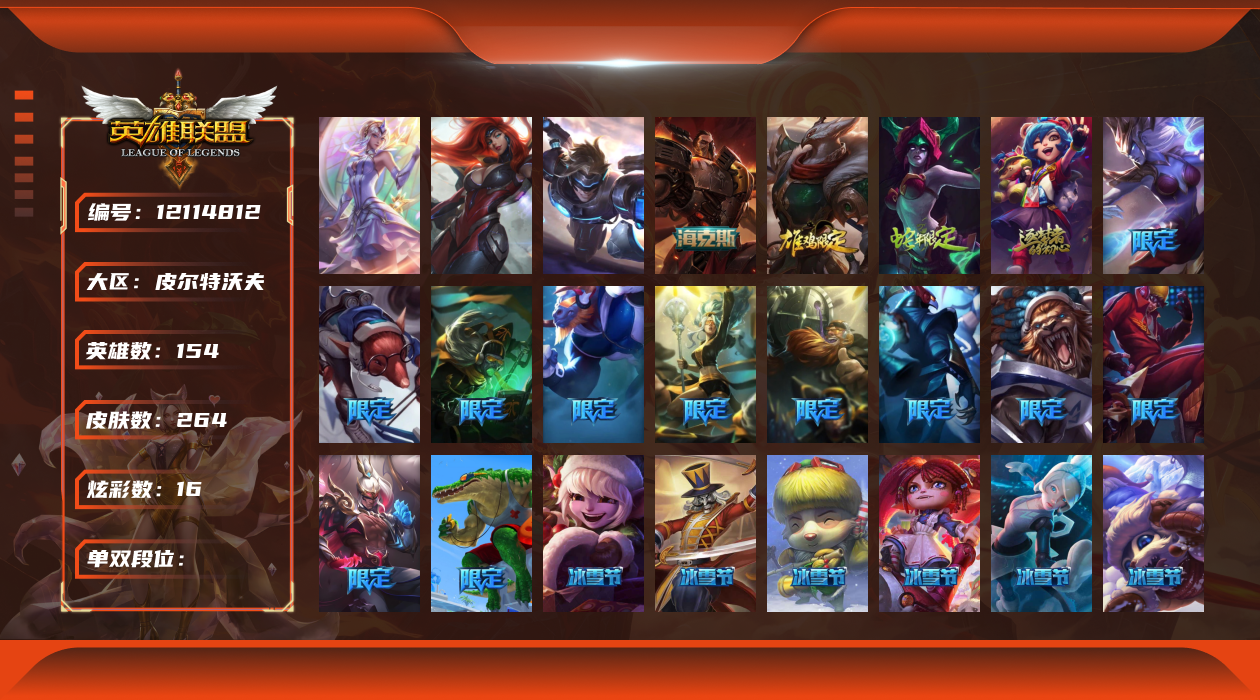 [12114812]3终极 4神话 47限定 24传说 71史诗 264皮肤 16炫彩 154英雄 可二次 可修改实名 优质装备:源代码 乐芙兰,防爆天使 凯尔,暗影 沃里克,电玩战魂 人马,防爆机器人 布里茨,防爆士兵 炼金,冠军典狱长 锤石,冠军之隐 劫,女猎手 希维尔,野兽猎人 瑟庄妮,野兽猎人 泰达米尔,大元素使,未来战士,武装战姬,冠军典狱长 锤石 凯旋圣装,冠军之隐 劫 凯旋圣装 海克斯:恐惧新星 德莱厄斯 赛季限定皮:胜利女神 莫甘娜,胜利女神 希维尔,胜利之树 茂凯,胜利枪神 格雷福斯,胜利女神 奥利安娜,胜利之剑 剑魔 冠军限定系列:S13 T1 李青,S1FNC 酒桶,S1FNC 迦娜,S1FNC 卡尔萨斯,S3 SKT T1 李青,S4 SSW 雷恩加尔,S4 SSW 图奇,S5 SKT T1 阿利斯塔,S5 SKT T1 阿兹尔,S6 SKT T1 球女 冰雪节限定:“主人不要我了” 阿木木,冰雪节 炼金,冰雪兽 纳尔,冬季仙境 发条,胡桃夹子 小丑,平安夜女神 娑娜,圣诞开心鬼 提莫,圣诞精灵 崔丝塔娜,圣诞老人 酒桶,圣诞糖果棒 厄运小姐,圣诞玩偶 波比,圣诞驯鹿 克格莫,冰雪节 茂凯,雪默丁格 泳池派对:泳池派对 雷克顿 万圣节限定:鬼影森森 茂凯,鬼影重重 魔腾,魅惑女巫 奈德丽,南瓜头 费德提克,无头骑士 人马 年限:蛇年 卡西奥佩娅,鸡年 阿兹尔 周年:10周年 安妮