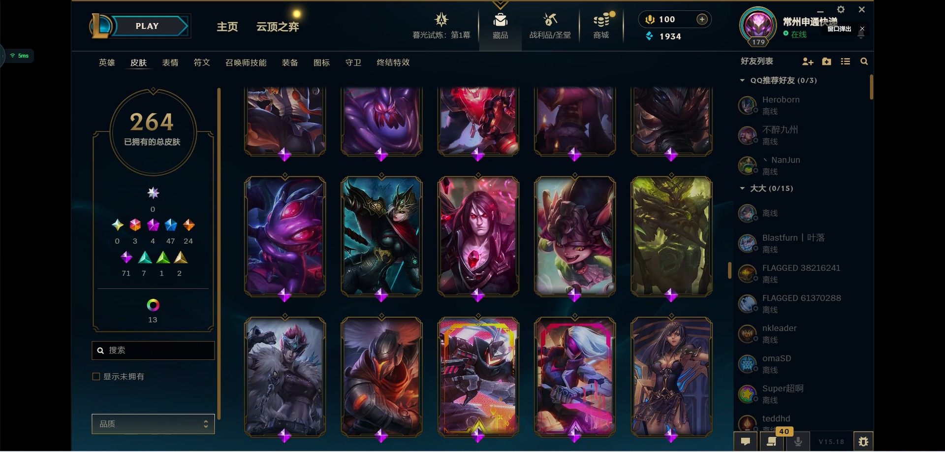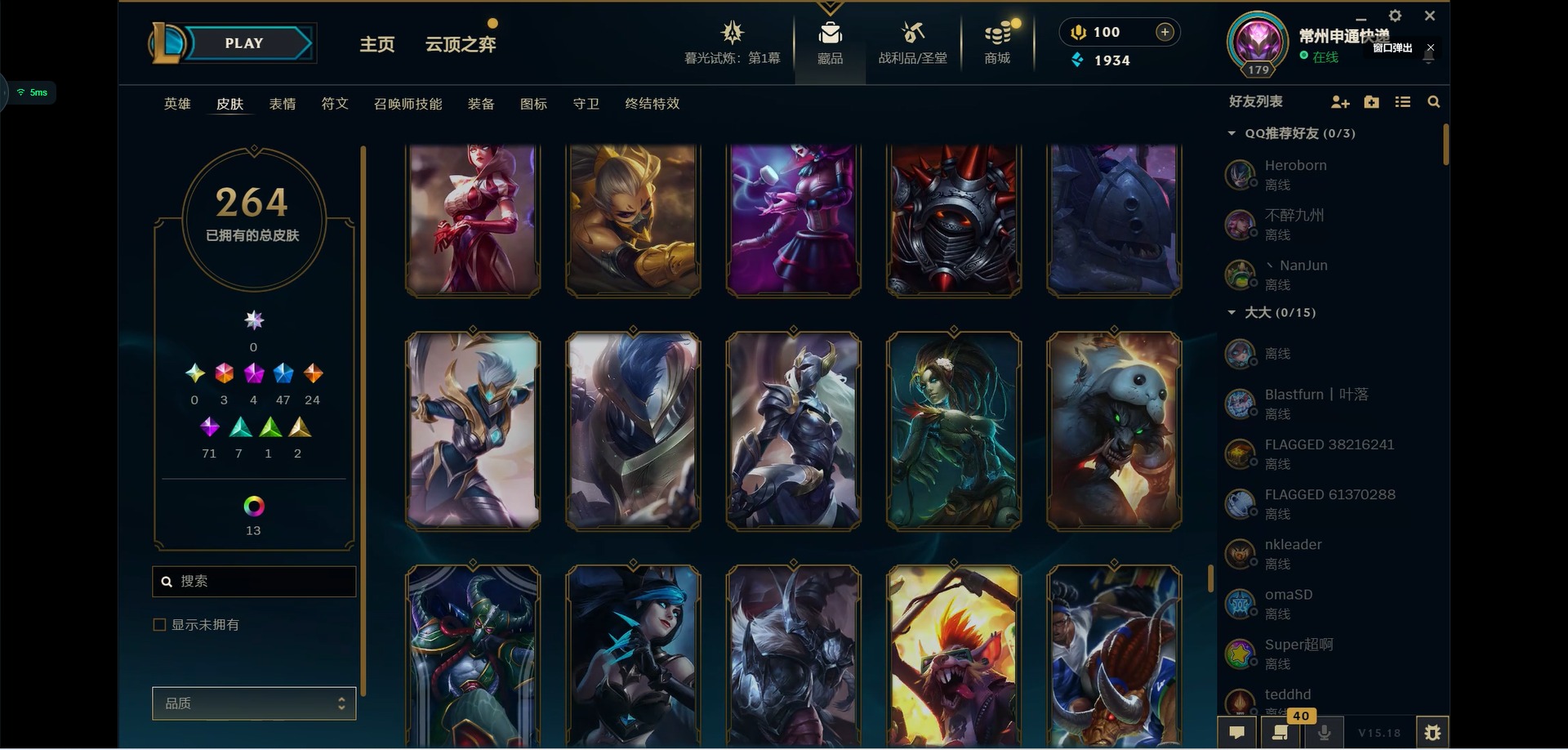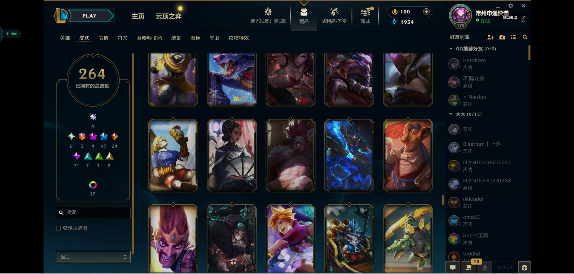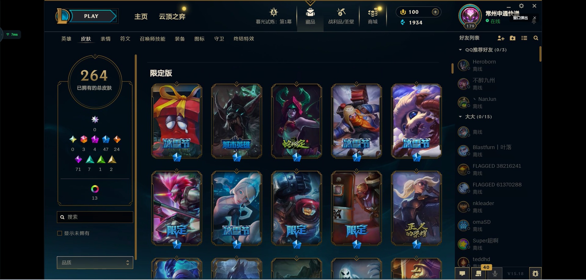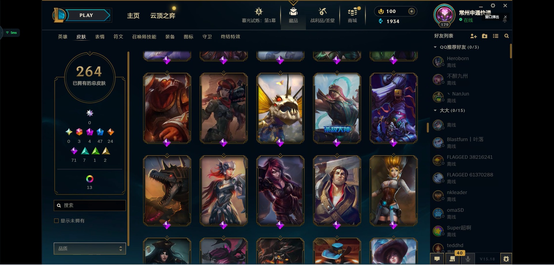 [12114812]3终极 4神话 47限定 24传说 71史诗 264皮肤 16炫彩 154英雄 可二次 可修改实名 优质装备:源代码 乐芙兰,防爆天使 凯尔,暗影 沃里克,电玩战魂 人马,防爆机器人 布里茨,防爆士兵 炼金,冠军典狱长 锤石,冠军之隐 劫,女猎手 希维尔,野兽猎人 瑟庄妮,野兽猎人 泰达米尔,大元素使,未来战士,武装战姬,冠军典狱长 锤石 凯旋圣装,冠军之隐 劫 凯旋圣装 海克斯:恐惧新星 德莱厄斯 赛季限定皮:胜利女神 莫甘娜,胜利女神 希维尔,胜利之树 茂凯,胜利枪神 格雷福斯,胜利女神 奥利安娜,胜利之剑 剑魔 冠军限定系列:S13 T1 李青,S1FNC 酒桶,S1FNC 迦娜,S1FNC 卡尔萨斯,S3 SKT T1 李青,S4 SSW 雷恩加尔,S4 SSW 图奇,S5 SKT T1 阿利斯塔,S5 SKT T1 阿兹尔,S6 SKT T1 球女 冰雪节限定:“主人不要我了” 阿木木,冰雪节 炼金,冰雪兽 纳尔,冬季仙境 发条,胡桃夹子 小丑,平安夜女神 娑娜,圣诞开心鬼 提莫,圣诞精灵 崔丝塔娜,圣诞老人 酒桶,圣诞糖果棒 厄运小姐,圣诞玩偶 波比,圣诞驯鹿 克格莫,冰雪节 茂凯,雪默丁格 泳池派对:泳池派对 雷克顿 万圣节限定:鬼影森森 茂凯,鬼影重重 魔腾,魅惑女巫 奈德丽,南瓜头 费德提克,无头骑士 人马 年限:蛇年 卡西奥佩娅,鸡年 阿兹尔 周年:10周年 安妮