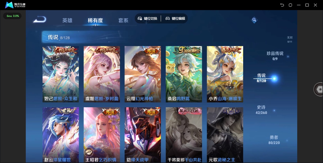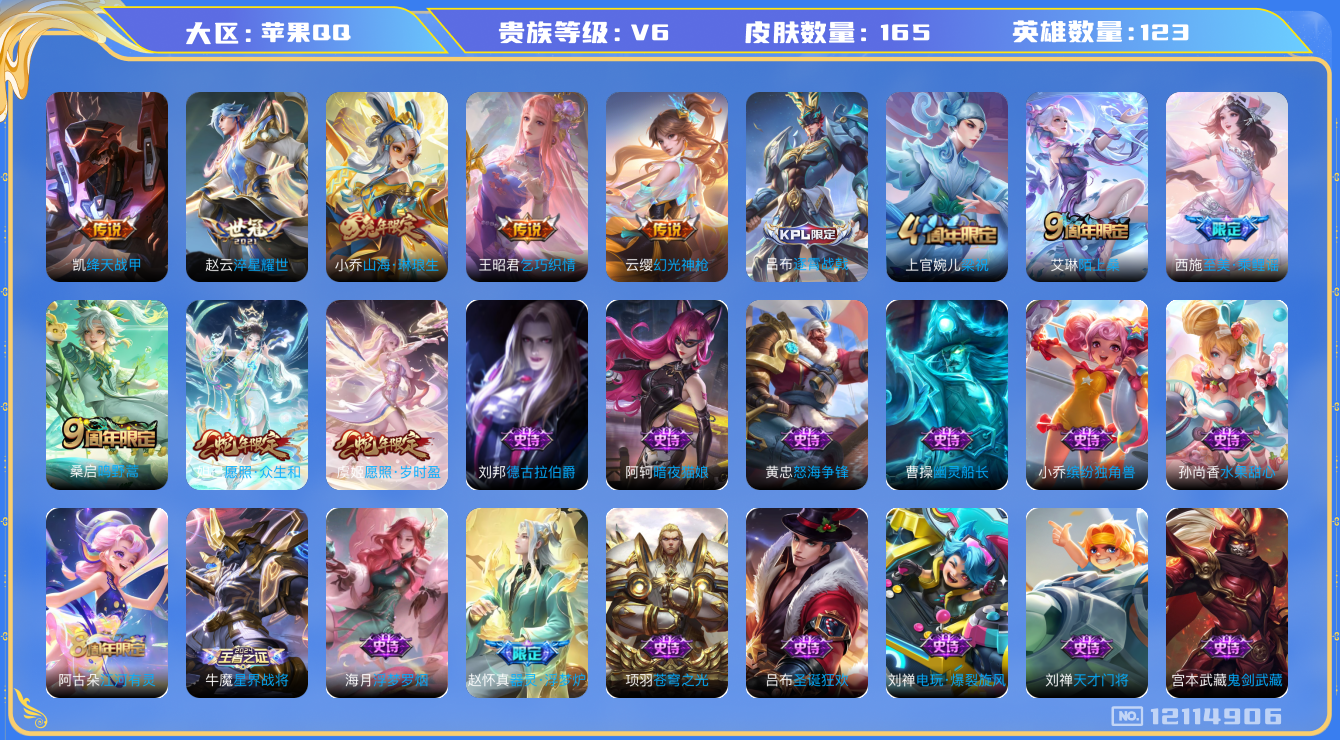 [12114906]V6 8传说 123英雄 165皮肤 可修改实名 女号 优质装备:绛天战甲(鸡嘴战神),乞巧织情,淬星耀世,山海·琳琅生(小乔年限) 传说皮:幻光神枪 珍宝阁皮:蔷薇恋人 限定皮:愿照·岁时盈(虞姬年限),愿照·众生和(妲己年限),逐霄战戟,陌上桑,鸣野蒿,至美·乘鲤谣,梁祝 史诗皮:器灵·浮梦炉,星界战将,星界特工,破空之剑,芈月浮光幕影,怒海争锋,苍穹之光,千年之狐,浮梦罗烟,江河有灵,百解令(蒙犽),电玩·爆裂旋风,偶像歌手,暗夜猫娘,女仆咖啡,水果甜心,天才门将,星夜王子,心灵骇客,时之奇旅-安琪拉,德古拉伯爵,暗隐猎兽者,幽灵船长,鬼剑武藏,心灵战警,拒霜思,缤纷独角兽,水晶猎龙者,唤灵魅影,原初追逐者,圣诞狂欢,鹰眼统帅,魅力维加斯,未来纪元-赵云