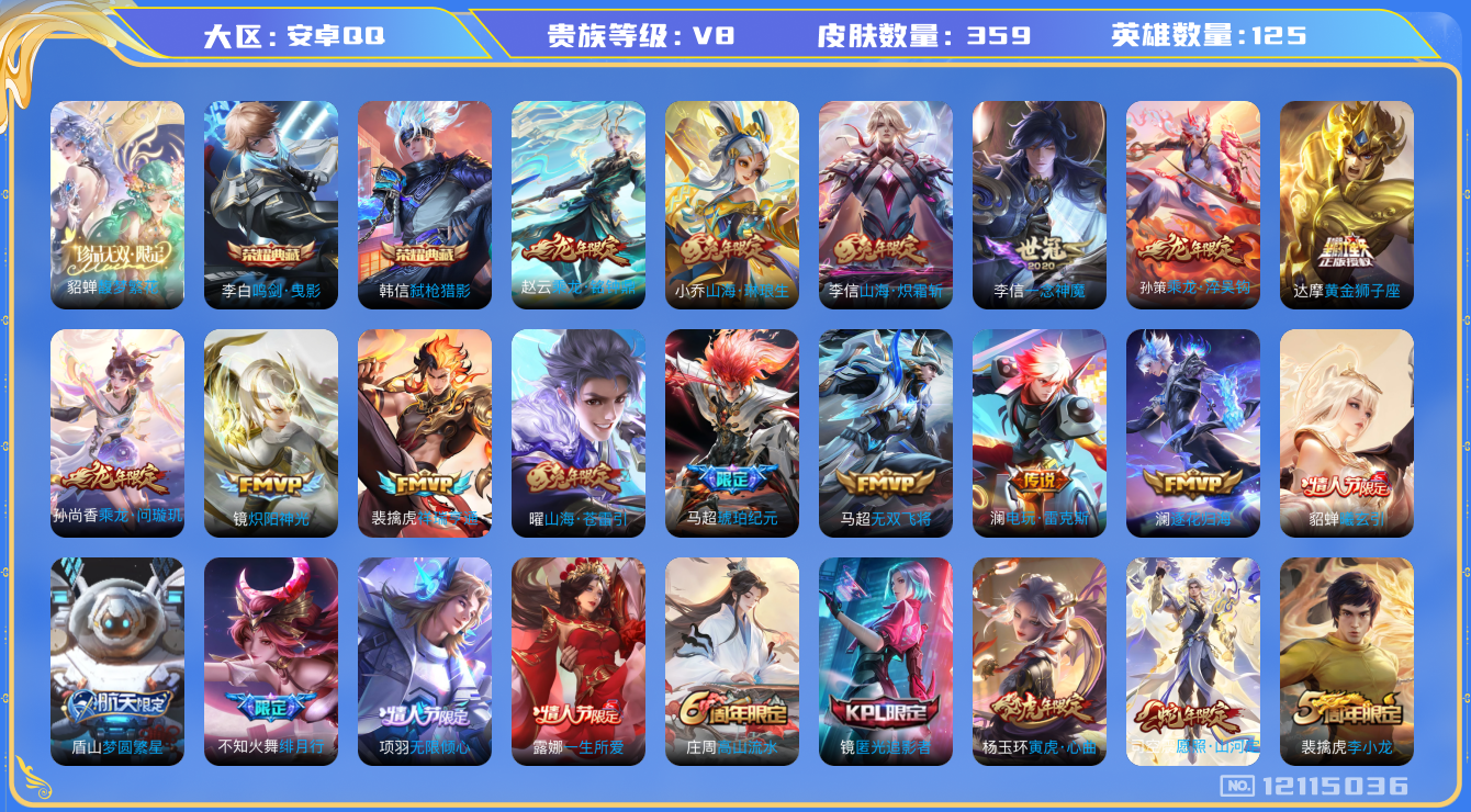 [12115036]V8 2典藏 1珍品无双 26传说 125英雄 359皮肤 可修改实名 优质装备:馥梦繁花,鸣剑·曳影,弑枪猎影(韩信典藏),黄金狮子座,炽阳神光,一念神魔,无双飞将,山海·炽霜斩(李信年限),山海·琳琅生(小乔年限),山海·苍雷引(电光曜子),电玩·雷克斯,澜逐花归海,琥珀纪元马超 传说皮:乘龙·问璇玑(孙尚香年限),乘龙·铭钟鼎(赵云年限),乘龙·淬吴钩(孙策年限),貂蝉曦玄引,祥瑞亨通 珍宝阁皮:妄想食味,万物之道,玩趣恶龙 限定皮:愿照·九州拓(澜年限),愿照·岁时盈(虞姬年限),愿照·山河定(司空震年限),愿照·千秋盛(女娲年限),鸣野蒿,傲雪梅枪,绯月行,时之彼端,神威(电光马子),山海·碧波行(瑶年限),无限倾心-项羽,瑞麟志(木兰年限),至美·乘鲤谣,高山流水,五谷丰年,武圣,梁祝,天狼绘梦者,李小龙,如梦令-嫦娥,默契交锋-花木兰,孙行者,一生所爱,神奇女侠,匿光追影者,寅虎·心曲(虎婆),深海之息(深海大菠萝),枫霜尽,神器·万象笔,梦圆繁星,山海·玄木吟(马可年限) 史诗皮:鸭鸭历险记-刘禅,器灵·浮梦炉,化蝶舞,龙之律动,琥珀纪元伽罗,雪豹·霜爪,星界战将,石田雨龙,百相守梦-周瑜,茶境仙,乘龙·忆丹青(大乔年限),谪仙醉月,破空之剑,蒙犽顽岩魄,乘龙·聚宝船(安琪拉年限),怒海争锋,蔬乡物语(鲁班七号),超元猎域,百相守梦-百里守约,紫霞仙子,苍穹之光,黄金分割率,特工魅影,千年之狐,永昼,冰冠公主,真我赫兹(镜),鹤归松栖(赵怀真),江河有灵,百解令(蒙犽),高渐离燃音魔法,蒙恬荣光圣徽,电玩·爆裂旋风,无限星赏官,偶像歌手,百相守梦(关羽),龙骑士(小龙虾),末日机甲-吕布,猫狗日记-孙策,猫狗日记-大乔,时之恋人-孙尚香,乱世虎臣,节奏热浪,修罗,女仆咖啡,摇滚巨星,水果甜心,绅士熊喵,天才门将,星夜王子,心灵骇客,功夫厨神,德古拉伯爵,暗隐猎兽者,幽灵船长,鬼剑武藏,暗渊魔法,心灵战警,乐园奇幻夜,天秀·启明,舞动绿茵,地狱岩魂,诗语江南,纤云弄巧,拒霜思,缤纷独角兽,乘风破浪,逐浪之夏,水晶猎龙者,曙光守护者,箭羽风息,金属风暴,原初追逐者,圣诞狂欢,圣诞恋歌,鹰眼统帅,暗夜贵公子,魅力维加斯,黎明之约,赏金猎手,滕王阁序,无心,未来纪元-赵云,玫瑰异探