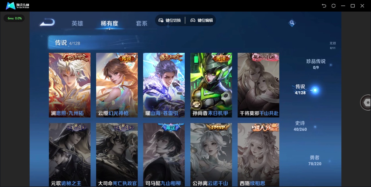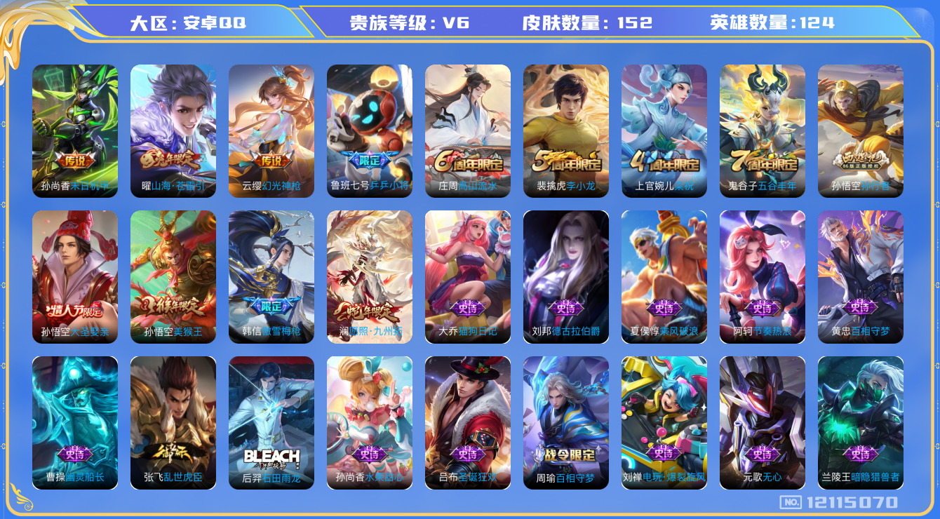 [12115070]V6 4传说 124英雄 152皮肤 可修改实名 优质装备:末日机甲-孙尚香(绿蚂蚱),山海·苍雷引(电光曜子) 传说皮:幻光神枪 珍宝阁皮:蔷薇恋人,女武神 限定皮:愿照·九州拓(澜年限),傲雪梅枪,高山流水,五谷丰年,梁祝,李小龙,孙行者,大圣娶亲,乒乒小将,美猴王 史诗皮:龙之律动,石田雨龙,百相守梦-周瑜,百相守梦-黄忠,特工魅影,蒙恬荣光圣徽,电玩·爆裂旋风,猫狗日记-大乔,乱世虎臣,节奏热浪,摇滚巨星,水果甜心,功夫厨神,德古拉伯爵,暗隐猎兽者,幽灵船长,乘风破浪,逐浪之夏,金属风暴,圣诞狂欢,圣诞恋歌,鹰眼统帅,魅力维加斯,黎明之约,无心,未来纪元-赵云