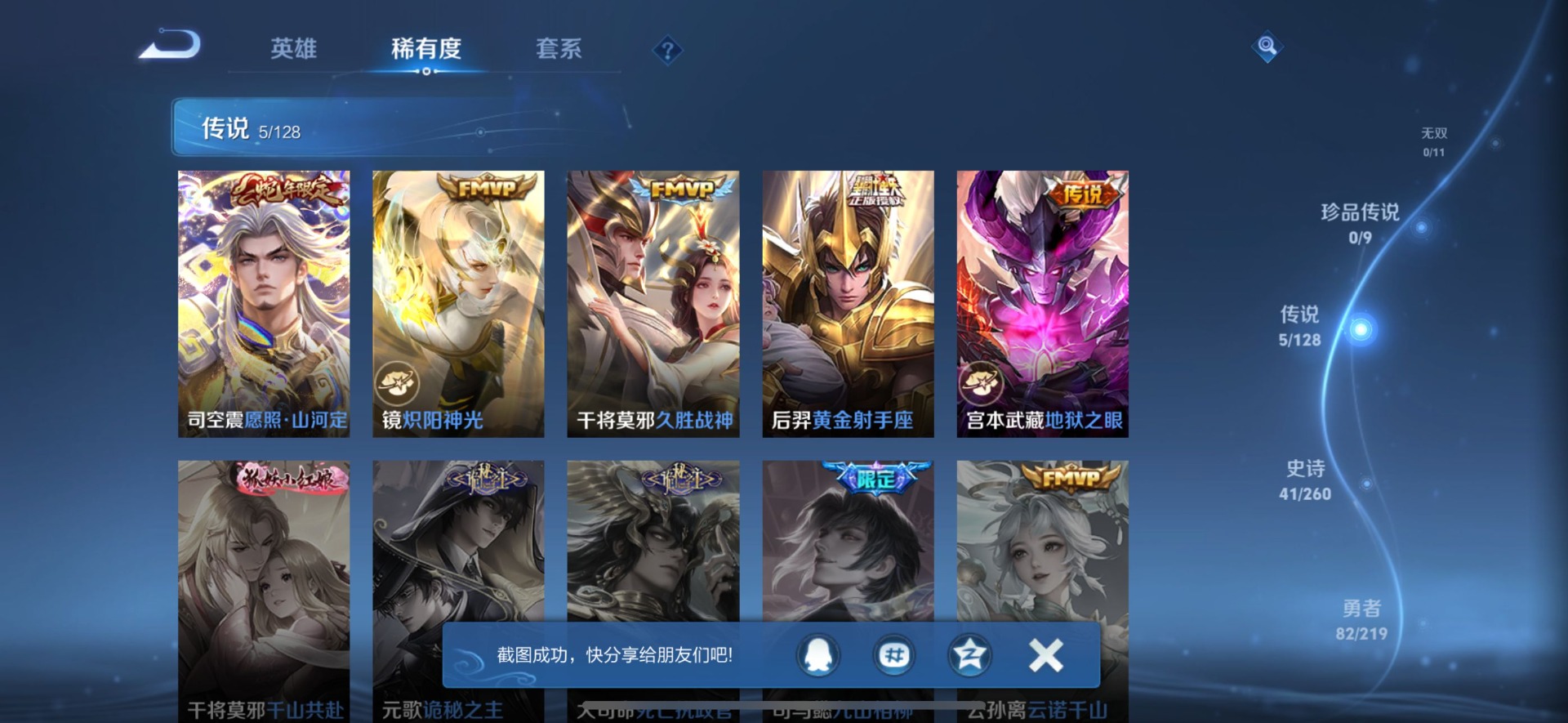 - [11852393]V7 5传说 123英雄 203皮肤 可修改实名 优质装备:黄金射手座,地狱之眼,李逍遥,淬星耀世,涂山容容 珍宝阁皮:玩趣恶龙 限定皮:逐霄战戟,鸣野蒿,至尊宝,五谷丰年,李小龙,孙行者,引擎之心,美猴王,山海·玄木吟(马可年限) 史诗皮:化蝶舞,龙之律动,石田雨龙,茶境仙,埋骨钱,蔬乡物语(鲁班七号),百相守梦-百里守约,百相守梦-黄忠,紫霞仙子,黄金分割率,江河有灵,魅语,冰冠公主,电玩·爆裂旋风,猫狗日记-孙策,猫狗日记-大乔,节奏热浪,摇滚巨星,水果甜心,绅士熊喵,天才门将,星夜王子,心灵骇客,功夫厨神,德古拉伯爵,暗隐猎兽者,幽灵船长,鬼剑武藏,地狱岩魂,乘风破浪,逐浪之夏,水晶猎龙者,曙光守护者,金属风暴,圣诞狂欢,圣诞恋歌,鹰眼统帅,赏金猎手,无心,未来纪元-赵云
