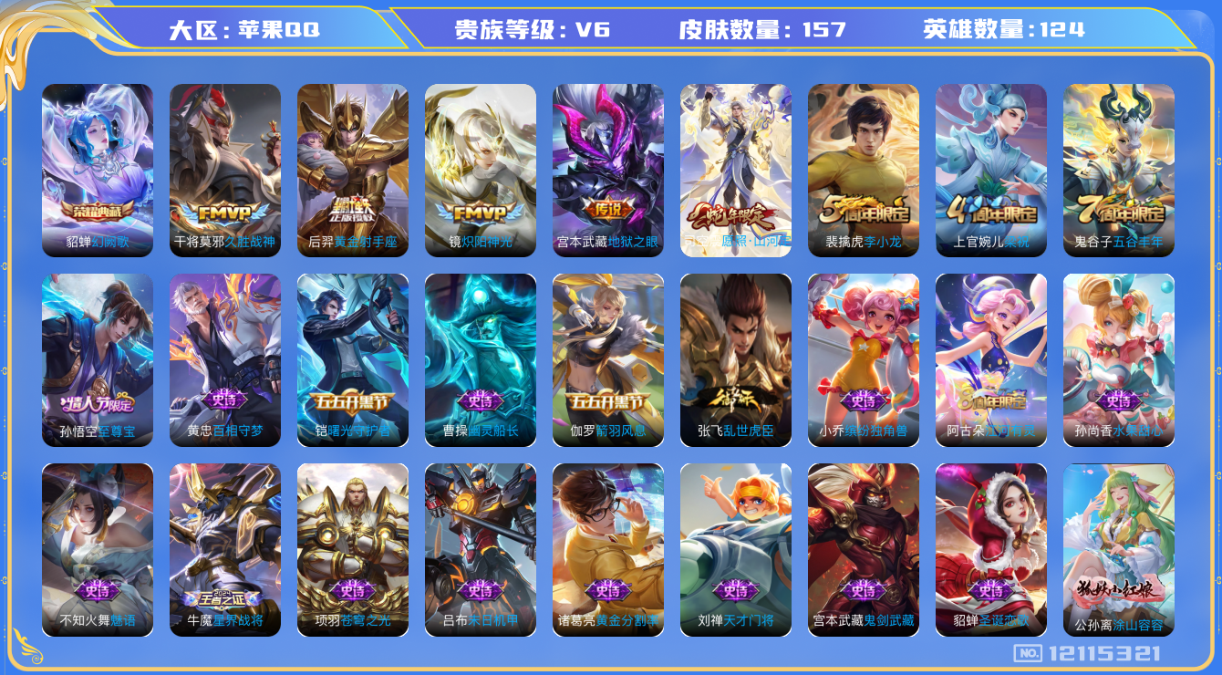 [12115321]V6 1典藏 5传说 124英雄 157皮肤 可修改实名 优质装备:幻阙歌(貂蝉典藏),黄金射手座,久胜战神,炽阳神光,地狱之眼,涂山容容 珍宝阁皮:妄想食味,玩趣恶龙 限定皮:愿照·山河定(司空震年限),至尊宝,五谷丰年,梁祝,李小龙 史诗皮:星界战将,星界特工,百相守梦-黄忠,苍穹之光,黄金分割率,特工魅影,江河有灵,魅语,蒙恬荣光圣徽,冰冠公主,晚萤,龙骑士(小龙虾),末日机甲-吕布,乱世虎臣,女仆咖啡,摇滚巨星,水果甜心,天才门将,心灵骇客,幽灵船长,鬼剑武藏,缤纷独角兽,逐浪之夏,水晶猎龙者,曙光守护者,箭羽风息,原初追逐者,圣诞恋歌,鹰眼统帅,魅力维加斯,黎明之约