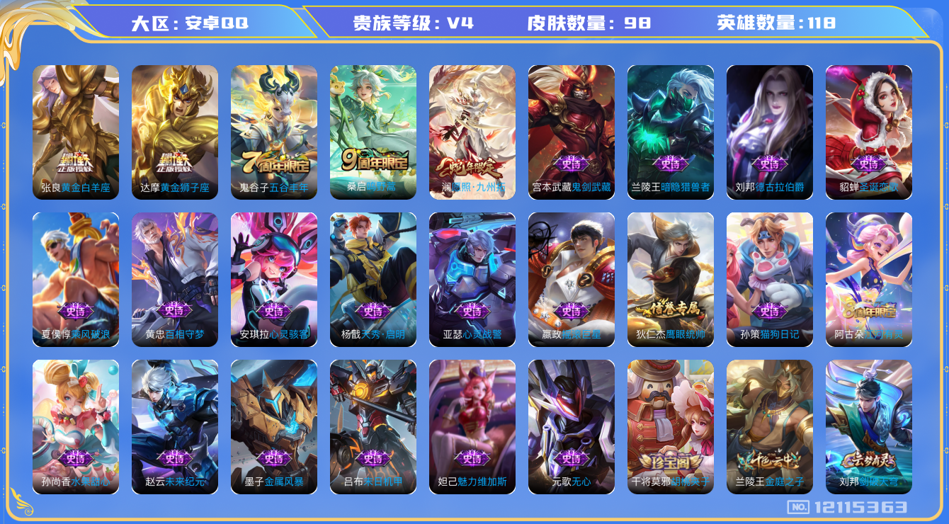 [12115363]V4 4传说 118英雄 98皮肤 可修改实名 优质装备:黄金狮子座,黄金白羊座 珍宝阁皮:胡桃夹子 限定皮:愿照·九州拓(澜年限),鸣野蒿,五谷丰年 史诗皮:百相守梦-黄忠,江河有灵,末日机甲-吕布,猫狗日记-孙策,摇滚巨星,水果甜心,心灵骇客,德古拉伯爵,暗隐猎兽者,鬼剑武藏,心灵战警,天秀·启明,乘风破浪,金属风暴,圣诞恋歌,鹰眼统帅,魅力维加斯,无心,未来纪元-赵云