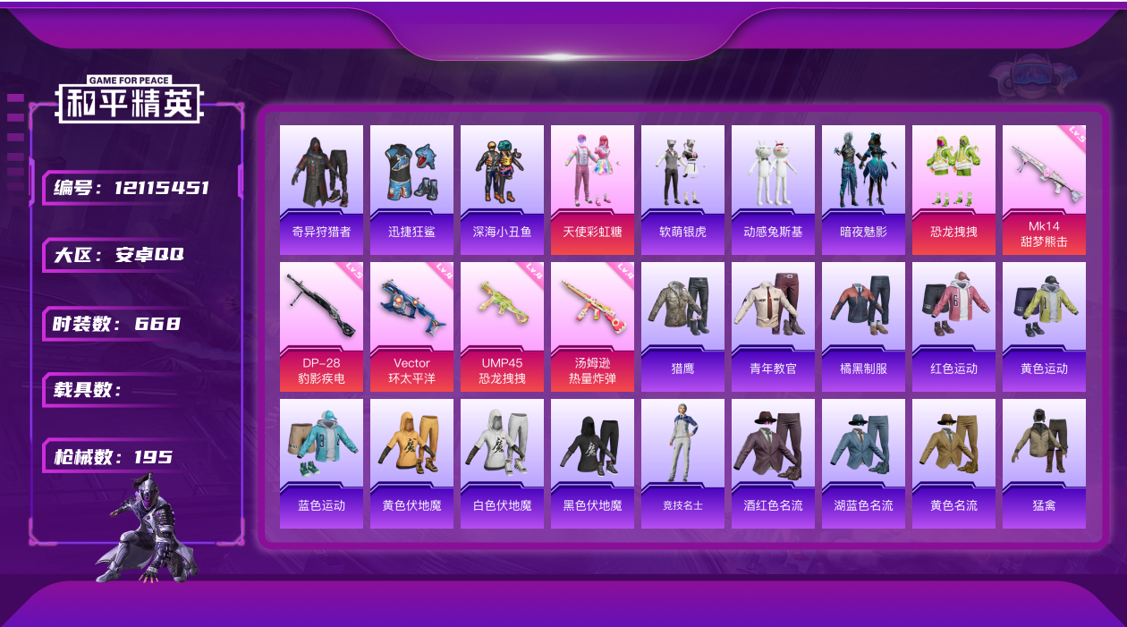 [12115451]2粉装 5特效枪 24印记 可二次 可修改实名 优质装备:奇异狩猎者,天使彩虹糖,UMP45恐龙拽拽,Vector环太平洋,MK14-甜梦熊击,汤姆逊-热量炸弹 热门装扮:恐龙拽拽,动感兔斯基,软萌银虎,迅捷狂鲨,深海小丑鱼,暗夜魅影 稀有枪皮:DP-28-豹影疾电 五级特效枪:五级DP-28-豹影疾电,五级MK14-甜梦熊击 四级特效枪:四级汤姆逊-热量炸弹,四级UMP45-恐龙拽拽,四级Vector-环太平洋 紫色装扮:SS22特训,娇憨猪猪,萌趣咩咩,SS21特训,SS31特训套装,SS5特训,人气偶像,冰川特警,冷焰舞者,北国孤狼,SS33特训套装,青涩时光,SS20特训,SS15特训,时空追击者,暴风机械师,SS16特训,银白舞王,SS13特训,治愈之星,迅捷之星,科技之星,SS14特训,萌趣颜团子,特种颜团子,飞驰魅影,音速流光,SS19特训,军刀雅典娜,豚鼠丹丹,吉莉礼服,雪兔飞飞,瑞龙福将,团圆交子,SS17特训,异彩先驱,SS18特训,都市魅力,酒红色名流,长空猛禽,雨林探路者,雪山精英,霓虹极客,霓虹街区,青年教官,青春校园,缤纷果语,耀眼新星,荣耀,蓝彩潮人,蓝色运动,街头潮人,跃动心情,风行保卫者,飞行日记,魅力单车,鹤鸣,麻辣教官,黄色伏地魔,黄色名流,黄色运动,黑色伏地魔,龙的传人,龟仙人,龙魂突击队,沙漠毒蛇,极速红龙,格斗先锋,橘黑制服,沙漠兵团,海岛探路者,深蓝色名流,幻影武者,坚韧舞者,夏日音浪,夜莺强袭者,完美偶像,帅气教官,幻世战舞者,怒火燎原,战地督导,湖蓝色名流,绮丽涂鸦,甜蜜菠萝,疯狂小兔子,白熊同盟,白色伏地魔,破晓战魂,破蛋小黄鸡,甜蜜告白,福星高照,空岛之星,空投萌叽,竞技勇士朋克,竞技达人朋克,红色运动,甜蜜熊情侣,牛气冲天,灰色格斗者,灼焰舞者,炫蓝之夏,热血青春,牛气满满,猛禽,特战英豪,特战装甲,狂沙舞者,猎鹰,镭射皇者,SS29特训,星途旅人,纯真浪花,热情海星,SS28特训,玉兔迎春,竞技名士,惊鸿侠骨,SS24特训(SS24特训套装),SS25特训,锦衣飞扬,粉红小猪,湖雨初晴,焰鹰斗篷,幻羽潜行,SS27特训,金羽特工,浪漫天命,SS26特训,SS6特训,SS7特训,深蓝冒险家,迷域探索者,淡雅花蕊,SS8特训,原初圣火,逆风勇士,SS12特训,众神之王,智慧之神,SS9特训,舞夜骑士,风华少年志,