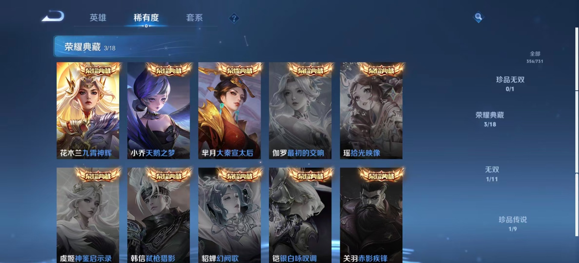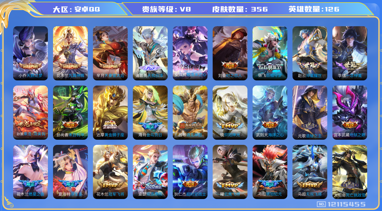 [12115455]V8 3典藏 1无双 1珍品传说 28传说 126英雄 356皮肤 女号 典藏英雄武则天 可修改实名 优质装备:天鹅之梦(小乔典藏),大秦宣太后,九霄神辉(木兰典藏),天机白泽,酷洛米之心,黄金狮子座,冠军飞将,云鹰飞将(小将军),炽阳神光,一念神魔,末日机甲-孙尚香(绿蚂蚱),海洋之心,地狱之眼,时之恋人-刘备(电焊工),淬星耀世,超时空战士-狄仁杰,无双飞将,燃星之曲,浮生妄,百相守梦(张飞),追逃游戏(亚瑟),遇见神鼓,琥珀纪元马超,金乌负日,黄金天蝎座,诡秘之主 传说皮:乘龙·淬吴钩(孙策年限),死亡执政官,幻光神枪 珍宝阁皮:妄想食味,玩趣恶龙 限定皮:愿照·山河定(司空震年限),逐霄战戟,鸣野蒿,至尊宝,白晶晶,山海·碧波行(瑶年限),遇见飞天,高山流水,五谷丰年,青龙志(铠年限),游园惊梦,梁祝,龙胆,天狼绘梦者,李小龙,天魔缭乱,美猴王,山海·玄木吟(马可年限) 史诗皮:鸭鸭历险记-刘禅,器灵·浮梦炉,化蝶舞,龙之律动,灵蛊蚀心,琥珀纪元伽罗,雪豹·霜爪,星界战将,百相守梦-周瑜,茶境仙,百相守梦-黄忠,破空之剑,蒙犽顽岩魄,蔬乡物语(鲁班七号),幻珠鲛人,守夜人,紫霞仙子,苍穹之光,电玩小子(小书包),特工魅影,千年之狐,永昼,冰冠公主,白蛇,江河有灵,雪夜绮愿(周瑜),百解令(蒙犽),蒙恬荣光圣徽,魅语,电玩·爆裂旋风,无限星赏官,偶像歌手,完美假期,龙骑士(小龙虾),暗夜猫娘,末日机甲-吕布,猫狗日记-孙策,猫狗日记-大乔,时之恋人-孙尚香,乱世虎臣,节奏热浪,修罗,女仆咖啡,摇滚巨星,水果甜心,绅士熊喵,天才门将,星夜王子,心灵骇客,功夫厨神,德古拉伯爵,暗隐猎兽者,幽灵船长,鬼剑武藏,心灵战警,乐园奇幻夜,舞动绿茵,地狱岩魂,诗语江南,纤云弄巧,繁星吟游(呼啦呼啦),拒霜思,缤纷独角兽,乘风破浪,逐浪之夏,月团寄思,水晶猎龙者,曙光守护者,热力回旋,箭羽风息,金属风暴,圣诞狂欢,圣诞恋歌,鹰眼统帅,暗夜贵公子,魅力维加斯,黎明之约,未来纪元-赵云