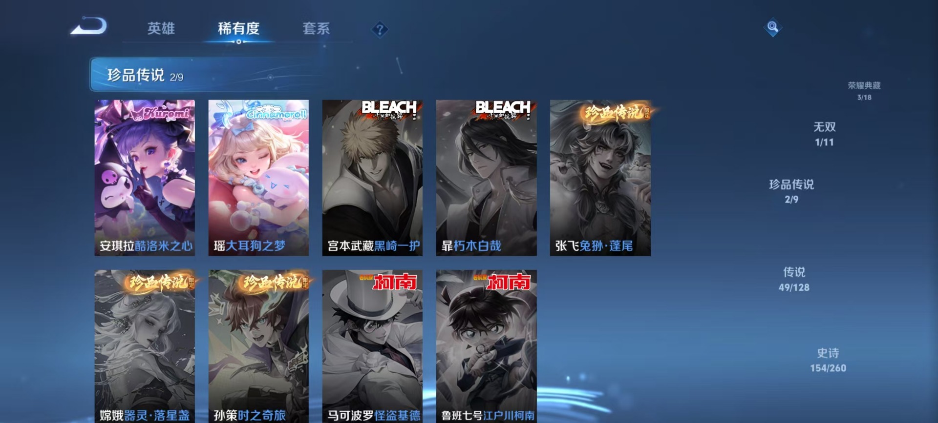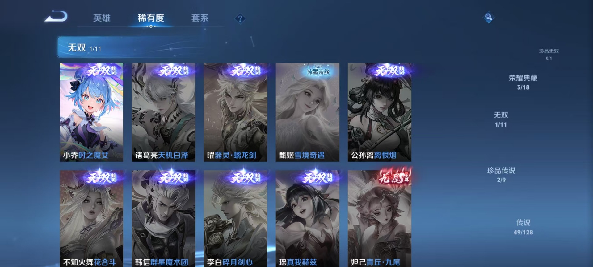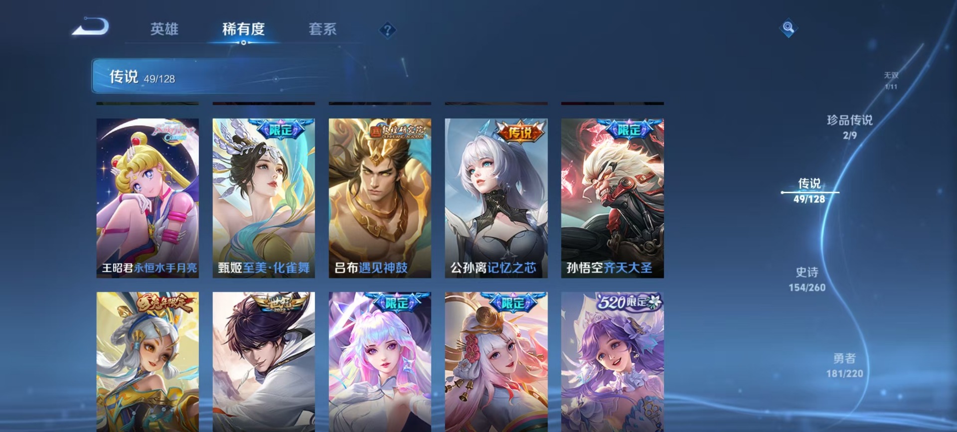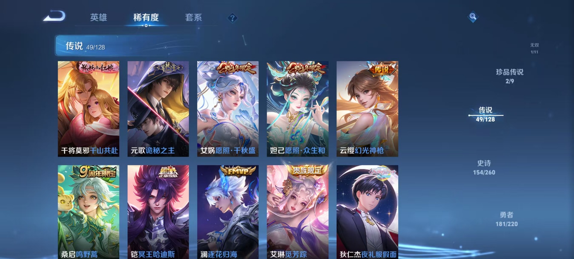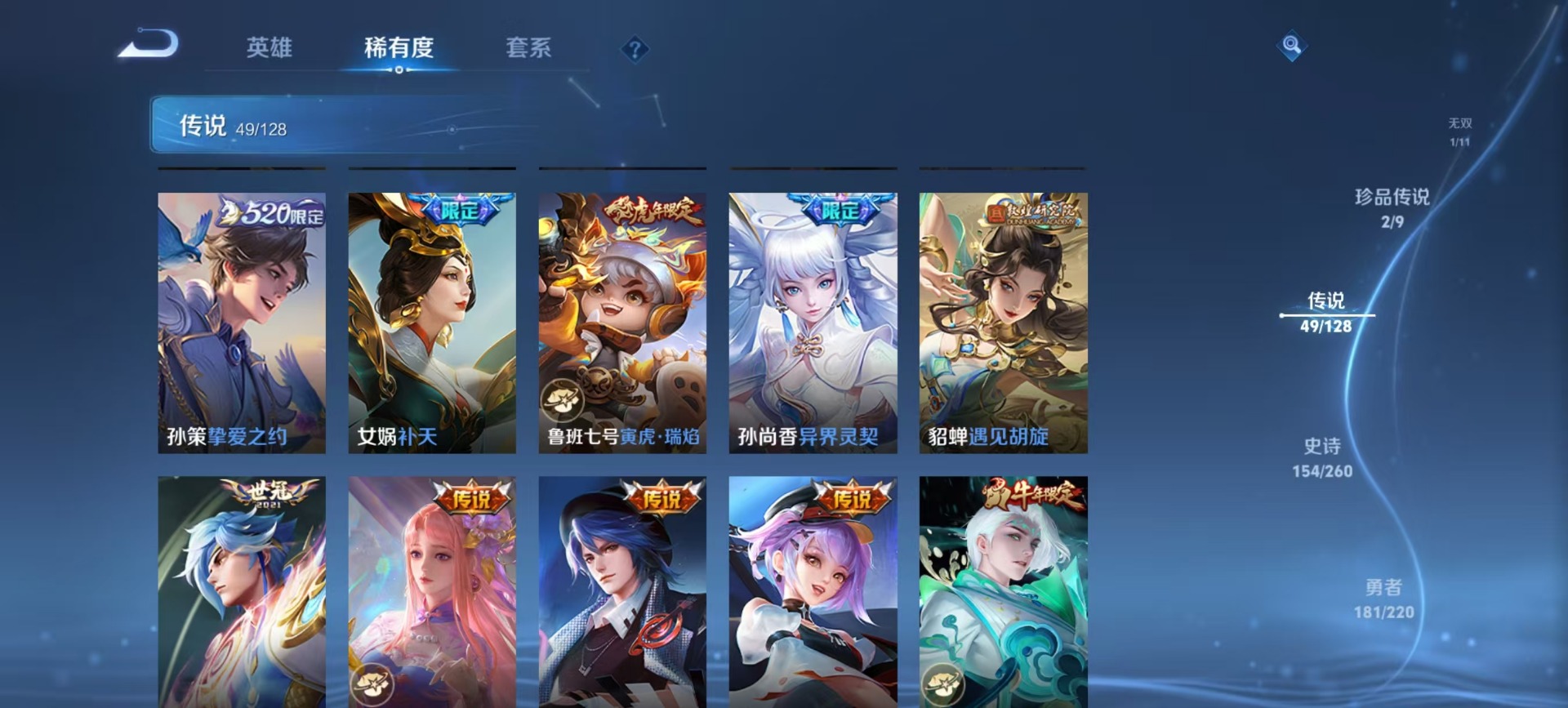 - PX_2093200-72 安卓QQ/荣耀王者/303皮肤/123英雄/1典藏/0珍品无双/0无双/2珍品传说/19传说/92史诗/8稀有英雄 【2 珍品传说】时之奇旅 孙策,器灵·落星盏 嫦娥, 【1 典藏皮肤】九霄神辉 花木兰, 【19 传说皮肤】启明星使 虞姬,无双飞将 马超,猫影幻舞 貂蝉,炽阳神光 镜,霜月吟 露娜,时之恋人 刘备,黄金狮子座 达摩,末日机甲 孙尚香,乘龙·淬吴钩 孙策,