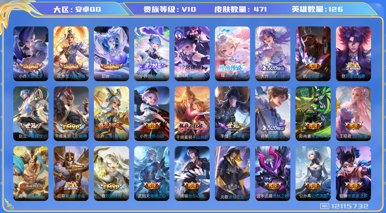 [12115732]V10 3典藏 1无双 2珍品传说 49传说 126英雄 471皮肤 典藏英雄武则天 可修改实名 优质装备:天鹅之梦(小乔典藏),九霄神辉(木兰典藏),幻阙歌(貂蝉典藏),小乔时之魔女(小乔无双),酷洛米之心,大耳狗之梦,黄金射手座,云鹰飞将(小将军),绛天战甲(鸡嘴战神),黄金白羊座,猫影幻舞,久胜战神,炽阳神光,一念神魔,云霓雀翎,末日机甲-孙尚香(绿蚂蚱),地狱火,仲夏夜之梦(大飞蛾),音你心动-小乔,海洋之心,地狱之眼,音你心动-周瑜,乞巧织情,淬星耀世,遇见胡旋,挚爱之约,挚爱花嫁,山海·琳琅生(小乔年限),记忆之芯(机甲兔),遇见神鼓,永恒水手月亮,夜礼服假面,澜逐花归海,艾琳觅芳踪,诡秘之主,千山共赴,涂山容容 传说皮:铠冥王哈迪斯,幻光神枪 珍宝阁皮:妄想食味,胡桃夹子,蔷薇恋人,女武神 限定皮:愿照·众生和(妲己年限),愿照·千秋盛(女娲年限),鸣野蒿,至尊宝,白虎志(电光耗子),凤求凰(白切鸡),太华(伽罗年限),武陵仙君(小桃花),异界灵契(白毛香),补天,寅虎·展翼(孙膑年限),前尘镜,星穹之声,时之彼端,时雨天司(水龙头),飞衡(韩信年限),瑞麟志(木兰年限),至美·乘鲤谣,至美·化雀舞,遇见飞天,高山流水,诗剑行,齐天大圣,五谷丰年,冰锋战神,天狼运算者,游园惊梦,梁祝,龙胆,天狼溯光者,逐梦之音,奔雷神使(牛魔年限),天狼绘梦者,李小龙,逐梦之影,朱雀志(守约年限),辉光之辰,如梦令-嫦娥,霸王别姬-虞姬,孙行者,一生所爱,大圣娶亲,引擎之心,青春决赛季,冰霜恋舞曲,乒乒小将,热情桑巴,女儿国国王,寅虎·瑞焰(虎皮蛋子),玉兔公主,时之奇旅-妲己,山海·玄木吟(马可年限) 史诗皮:鸭鸭历险记-刘禅,器灵·浮梦炉,绮世丹青,化蝶舞,龙之律动,灵蛊蚀心,星界战将,布丁狗之誓,石田雨龙,百相守梦-周瑜,茶境仙,百相守梦-黄忠,破空之剑,战舞者,涂山红红,东方月初,幻珠鲛人,织梦人,遇见神鹿,紫霞仙子,苍穹之光,电玩小子(小书包),黄金分割率,特工魅影,千年之狐,冰冠公主,白蛇,真我赫兹(百里守约),江河有灵,青蛇,百解令(蒙犽),魅语,电玩·爆裂旋风,无限星赏官,偶像歌手,电玩·兔顽号,匿光破解者,百相守梦(刘备),龙骑士(小龙虾),暗夜猫娘,末日机甲-吕布,猫狗日记-孙策,猫狗日记-大乔,时之恋人-孙尚香,乱世虎臣,节奏热浪,修罗,女
