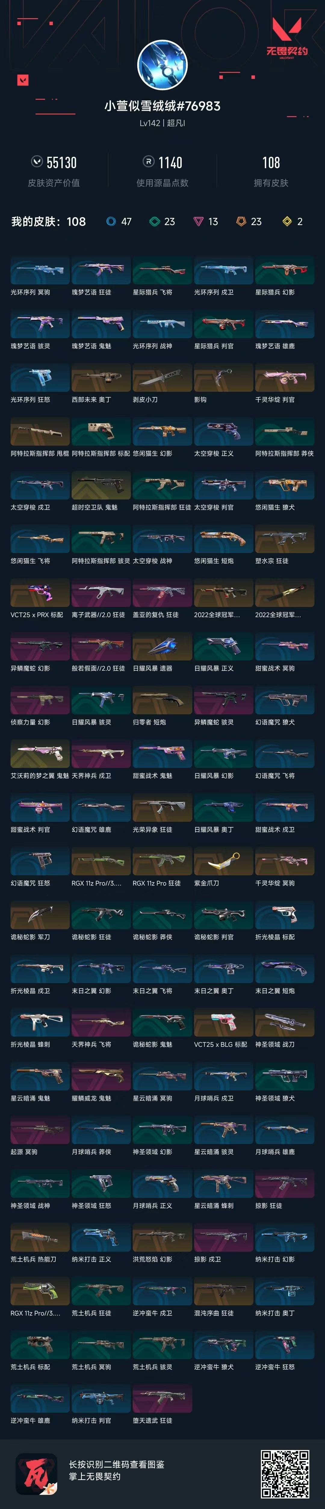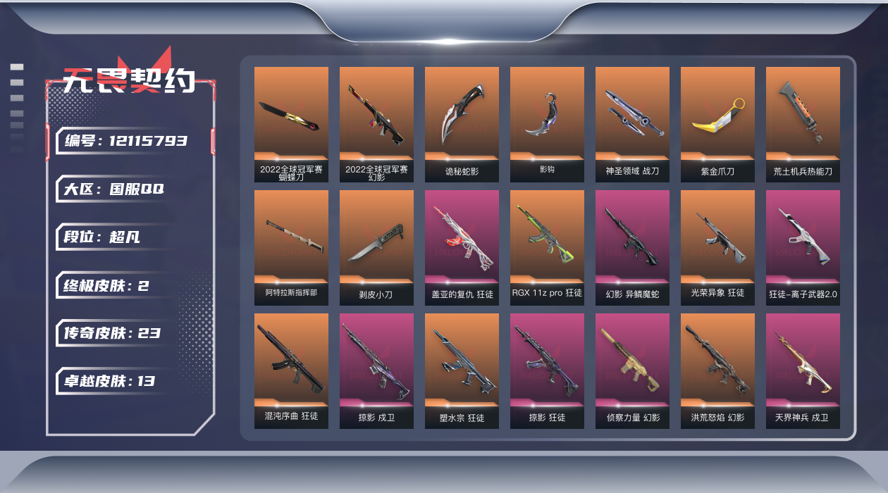 [12115793]23橙皮 2金皮 13紫皮 108皮肤 27英雄 110卡面 1140已用源晶 超凡 优质装备:狂徒-塑水宗,冥驹-千灵华绽,狂徒-混沌序曲,狂徒-掠影,狂徒-盖亚的复仇,幻影-侦察力量,幻影-洪荒怒焰,正义-RGX 11z Pro 3.0,戍卫-掠影,冥驹-起源,戍卫-天界神兵,飞将-天界神兵,剥皮小刀,紫金爪刀,判官-千灵华绽,鬼魅-艾沃莉的梦之翼,荒土机兵热能刀,神圣领域 战刀,诡秘蛇影,阿特拉斯指挥部,影钩,鬼魅-耀鳞威龙 亮点皮肤:幻影-2022全球冠军赛,2022全球冠军赛 蝴蝶刀 套装:2022全球冠军赛 佩枪皮肤:标配-VCT25xBLG,标配-VCT25xPRX,鬼魅-超时空卫队,短炮-归零者 冲锋枪皮肤:骇灵-异鳞魔蛇 步枪皮肤:幻影-异鳞魔蛇,狂徒-般若假面//2.0,狂徒-光荣异象,RGX 11z pro 狂徒,狂徒-离子武器2.0,狂徒-堕天遗武 狙击枪皮肤:莽侠-RGX 11z Pro 3.0 机枪皮肤:奥丁-西部未来