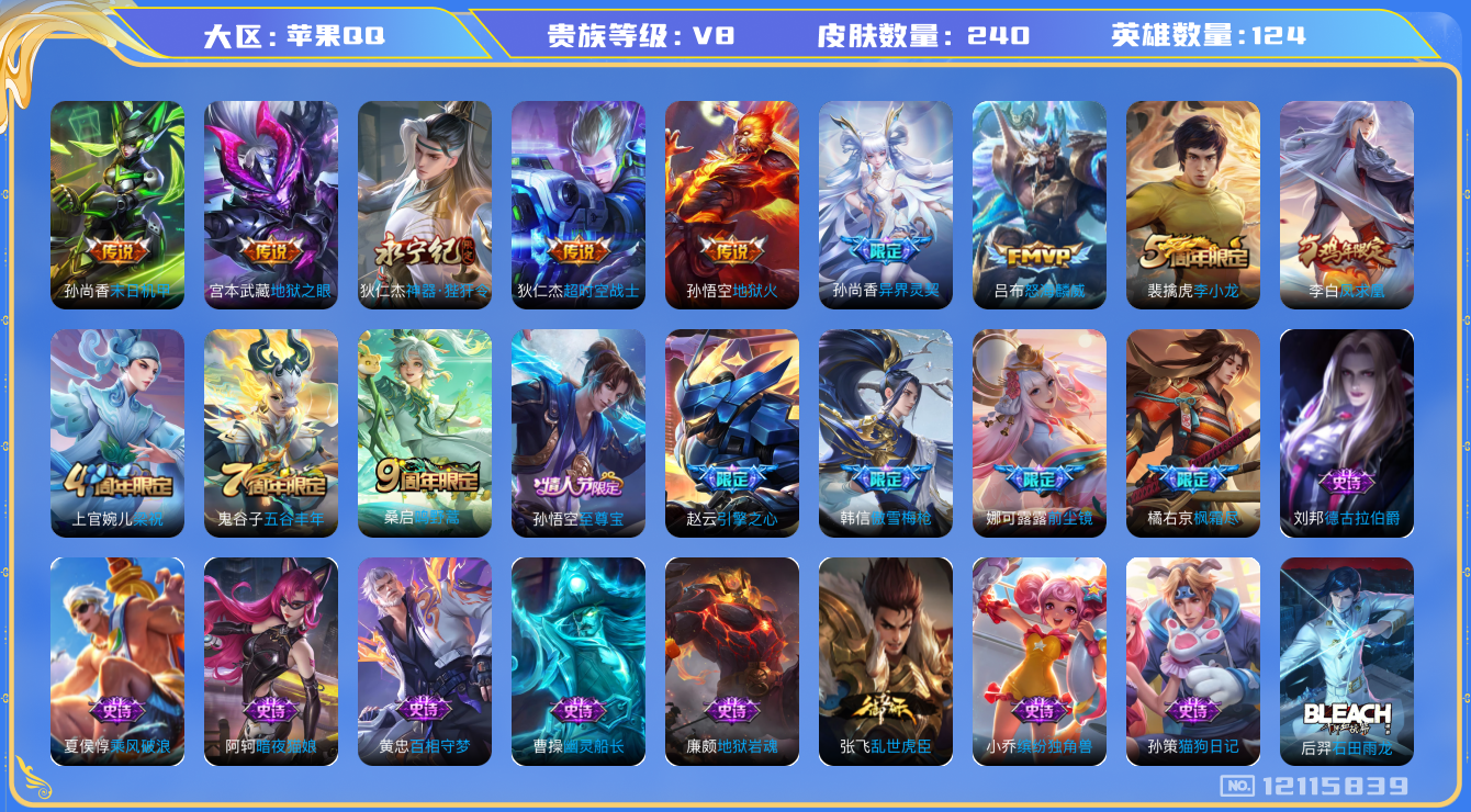 [12115839]V8 12传说 124英雄 240皮肤 可修改实名 女号 优质装备:末日机甲-孙尚香(绿蚂蚱),地狱火,地狱之眼,超时空战士-狄仁杰,神器·狴犴令,涂山容容 珍宝阁皮:胡桃夹子,玩趣恶龙 限定皮:鸣野蒿,至尊宝,凤求凰(白切鸡),异界灵契(白毛香),傲雪梅枪,前尘镜,怒海麟威,五谷丰年,梁祝,李小龙,引擎之心,枫霜尽 史诗皮:龙之律动,星界战将,石田雨龙,百相守梦-黄忠,紫霞仙子,电玩小子(小书包),特工魅影,千年之狐,永昼,冰冠公主,蒙恬荣光圣徽,晚萤,偶像歌手,龙骑士(小龙虾),暗夜猫娘,猫狗日记-孙策,乱世虎臣,女仆咖啡,水果甜心,绅士熊喵,星夜王子,心灵骇客,功夫厨神,德古拉伯爵,幽灵船长,鬼剑武藏,心灵战警,地狱岩魂,纤云弄巧,繁星吟游(呼啦呼啦),拒霜思,缤纷独角兽,乘风破浪,逐浪之夏,圣诞狂欢,圣诞恋歌,鹰眼统帅,暗夜贵公子,魅力维加斯,黎明之约,无心,未来纪元-赵云