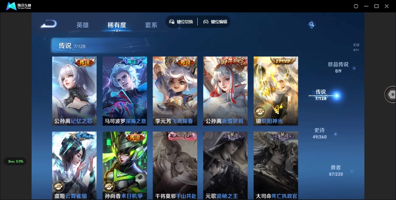 - PX_2094448-21 安卓QQ/最强王者/308皮肤/125英雄/1典藏/0珍品无双/1无双/2珍品传说/49传说/104史诗/9稀有英雄 【2 珍品传说】怪盗基德 马可波罗,江户川柯南 鲁班七号, 【1 典藏皮肤】鸣剑·曳影 李白, 【1 无双皮肤】器灵·螭龙剑 曜, 【49 传说皮肤】鹤归松栖 云缨,武圣 关羽,永恒水手月亮 王昭君,启明星使 虞姬,无限倾心 虞姬,碎云 百里守约,逐花归