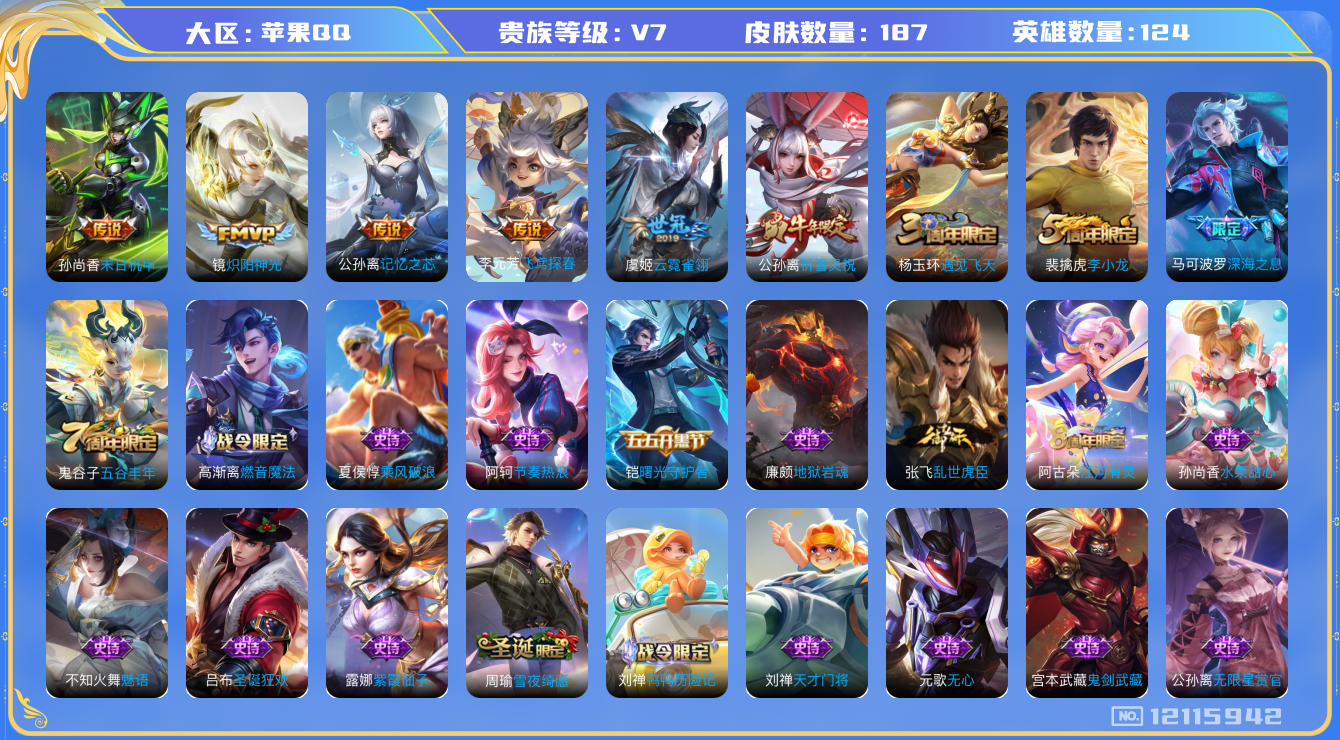 [12115942]V7 7传说 124英雄 187皮肤 可修改实名 女号 优质装备:炽阳神光,云霓雀翎,末日机甲-孙尚香(绿蚂蚱),飞鸢探春,记忆之芯(机甲兔) 珍宝阁皮:优雅恋人,蔷薇恋人 限定皮:遇见飞天,五谷丰年,祈雪灵祝(雪兔子),李小龙,深海之息(深海大菠萝) 史诗皮:赞萌露比,鸭鸭历险记-刘禅,上官婉儿群星魔术团,守夜人,紫霞仙子,特工魅影,江河有灵,雪夜绮愿(周瑜),百解令(蒙犽),高渐离燃音魔法,蒙恬荣光圣徽,魅语,无限星赏官,乱世虎臣,节奏热浪,水果甜心,天才门将,星夜王子,心灵骇客,鬼剑武藏,舞动绿茵,地狱岩魂,纤云弄巧,拒霜思,乘风破浪,逐浪之夏,水晶猎龙者,曙光守护者,金属风暴,原初追逐者,圣诞狂欢,圣诞恋歌,鹰眼统帅,黎明之约,赏金猎手,无心,未来纪元-赵云