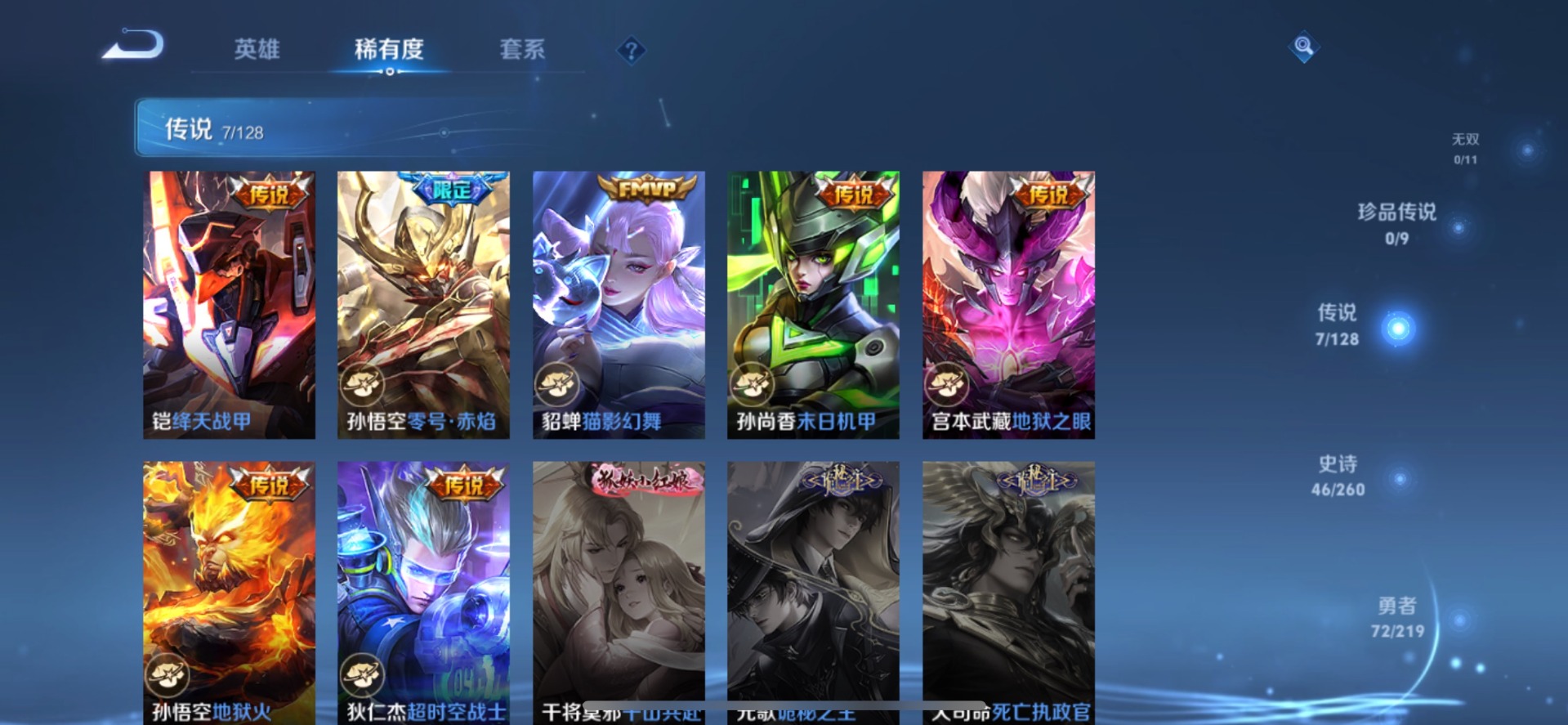 - [12277795]V7 1典藏 11传说 123英雄 222皮肤 可修改实名 优质装备:神鉴启示录,黄金射手座,云鹰飞将(小将军),末日机甲-孙尚香(绿蚂蚱),地狱火,时之恋人-刘备(电焊工),淬星耀世,无双飞将,鹤羽星尊,涂山容容 传说皮:幻光神枪 珍宝阁皮:玩趣恶龙 限定皮:愿照·九州拓(澜年限),逐霄战戟,鸣野蒿,李小龙,孙行者 史诗皮:器灵·浮梦炉,茶境仙,破空之剑,百相守梦-百里守约,百相守梦-黄忠,电玩小子(小书包),黄金分割率,特工魅影,千年之狐,冰冠公主,偶像歌手,电玩·爆裂旋风,猫狗日记-孙策,猫狗日记-大乔,修罗,女仆咖啡,水果甜心,星夜王子,心灵骇客,功夫厨神,德古拉伯爵,暗隐猎兽者,鬼剑武藏,心灵战警,天秀·启明,舞动绿茵,地狱岩魂,纤云弄巧,繁星吟游(呼啦呼啦),乘风破浪,月团寄思,水晶猎龙者,曙光守护者,金属风暴,圣诞狂欢,圣诞恋歌,鹰眼统帅,暗夜贵公子,魅力维加斯,未来纪元-赵云