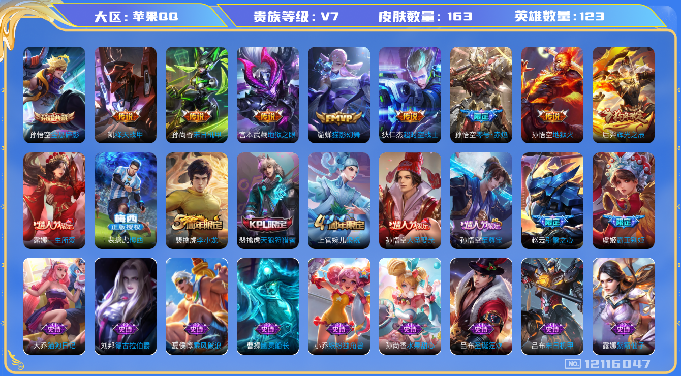 [12116047]V7 1典藏 7传说 123英雄 163皮肤 可修改实名 优质装备:全息碎影(猴子典藏),绛天战甲(鸡嘴战神),猫影幻舞,末日机甲-孙尚香(绿蚂蚱),地狱火,零号·赤焰,地狱之眼,超时空战士-狄仁杰 限定皮:至尊宝,梅西,梁祝,天狼狩猎者,李小龙,辉光之辰,霸王别姬-虞姬,一生所爱,大圣娶亲,引擎之心 史诗皮:紫霞仙子,黄金分割率,特工魅影,千年之狐,永昼,偶像歌手,末日机甲-吕布,猫狗日记-大乔,修罗,水果甜心,星夜王子,心灵骇客,德古拉伯爵,暗隐猎兽者,幽灵船长,鬼剑武藏,天秀·启明,繁星吟游(呼啦呼啦),缤纷独角兽,乘风破浪,金属风暴,原初追逐者,圣诞狂欢,圣诞恋歌,鹰眼统帅,黎明之约,未来纪元-赵云