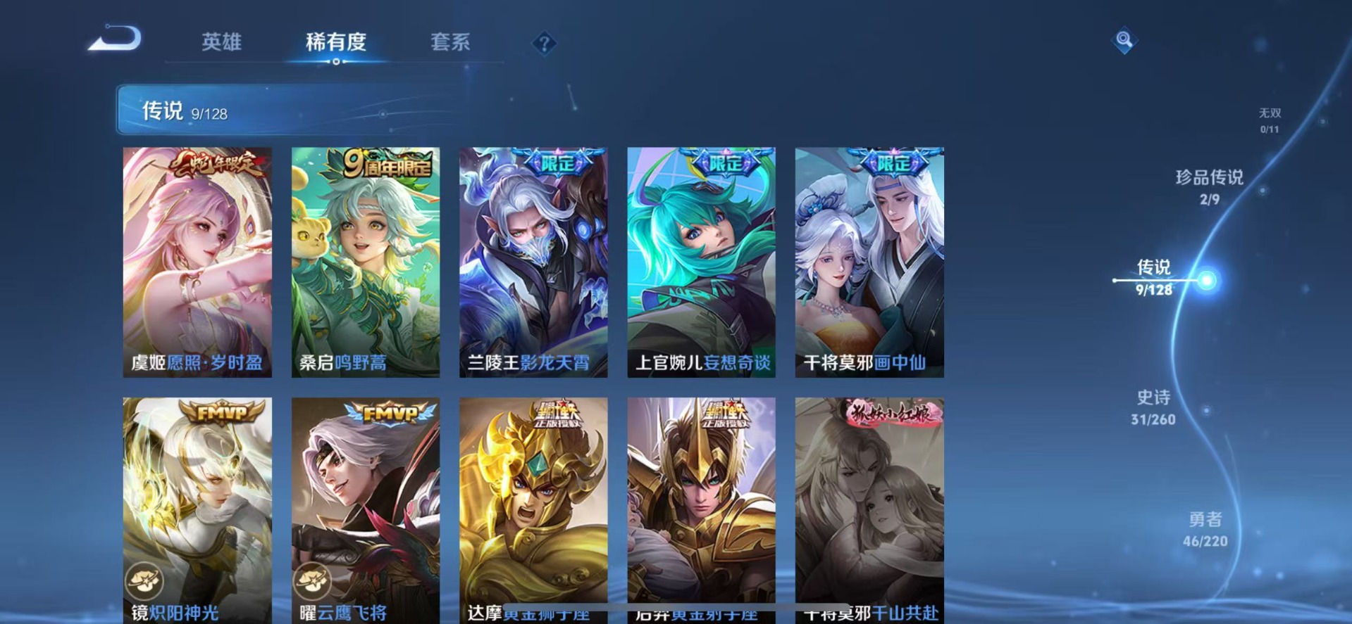 - [11254715]V5 4传说 120英雄 120皮肤 可修改实名 优质装备:久胜战神,零号·赤焰 珍宝阁皮:妄想食味 限定皮:愿照·山河定(司空震年限),鸣野蒿,李小龙,如梦令-后羿 史诗皮:化蝶舞,龙之律动,紫霞仙子,特工魅影,千年之狐,节奏热浪,修罗,水果甜心,星夜王子,幽灵船长,心灵战警,纤云弄巧,缤纷独角兽,箭羽风息,圣诞狂欢,鹰眼统帅,暗夜贵公子,魅力维加斯,未来纪元-赵云