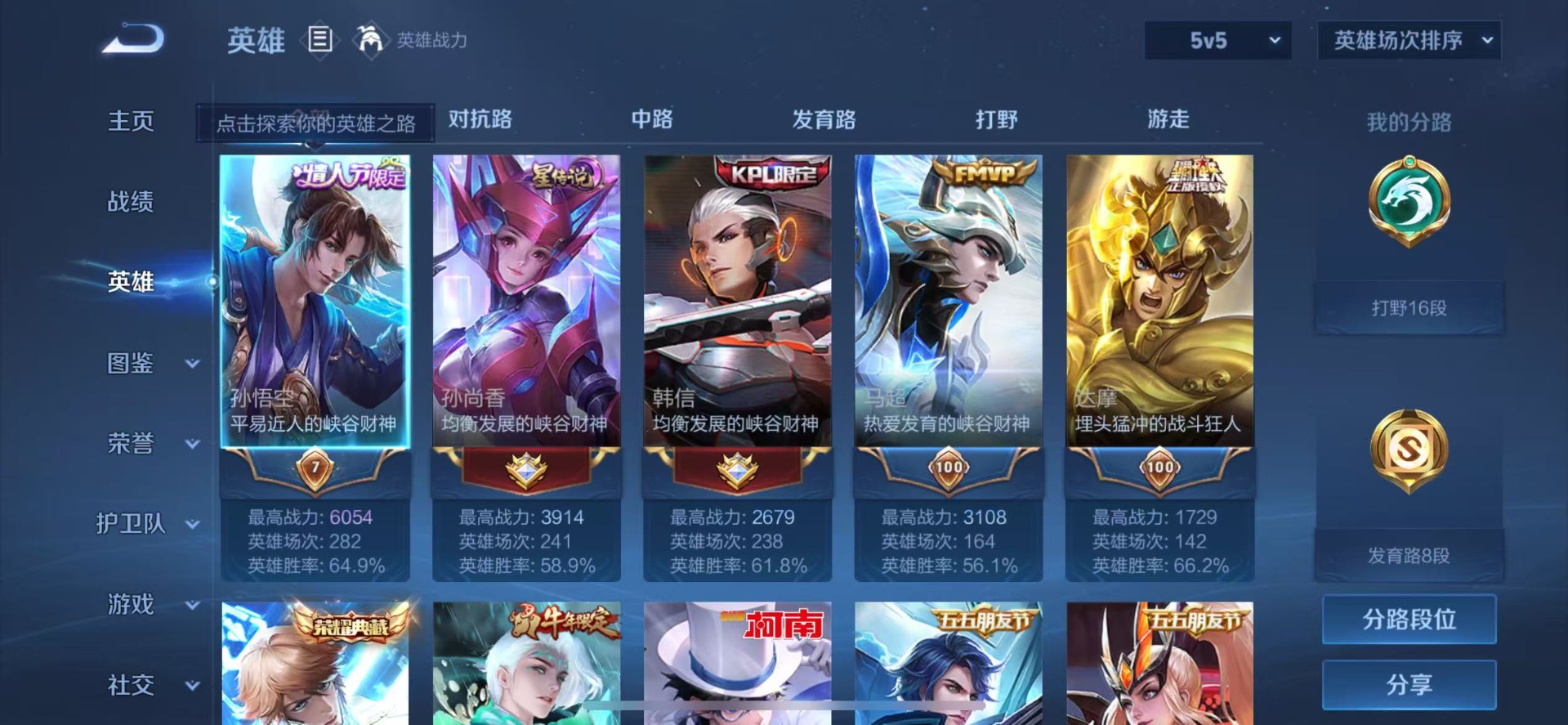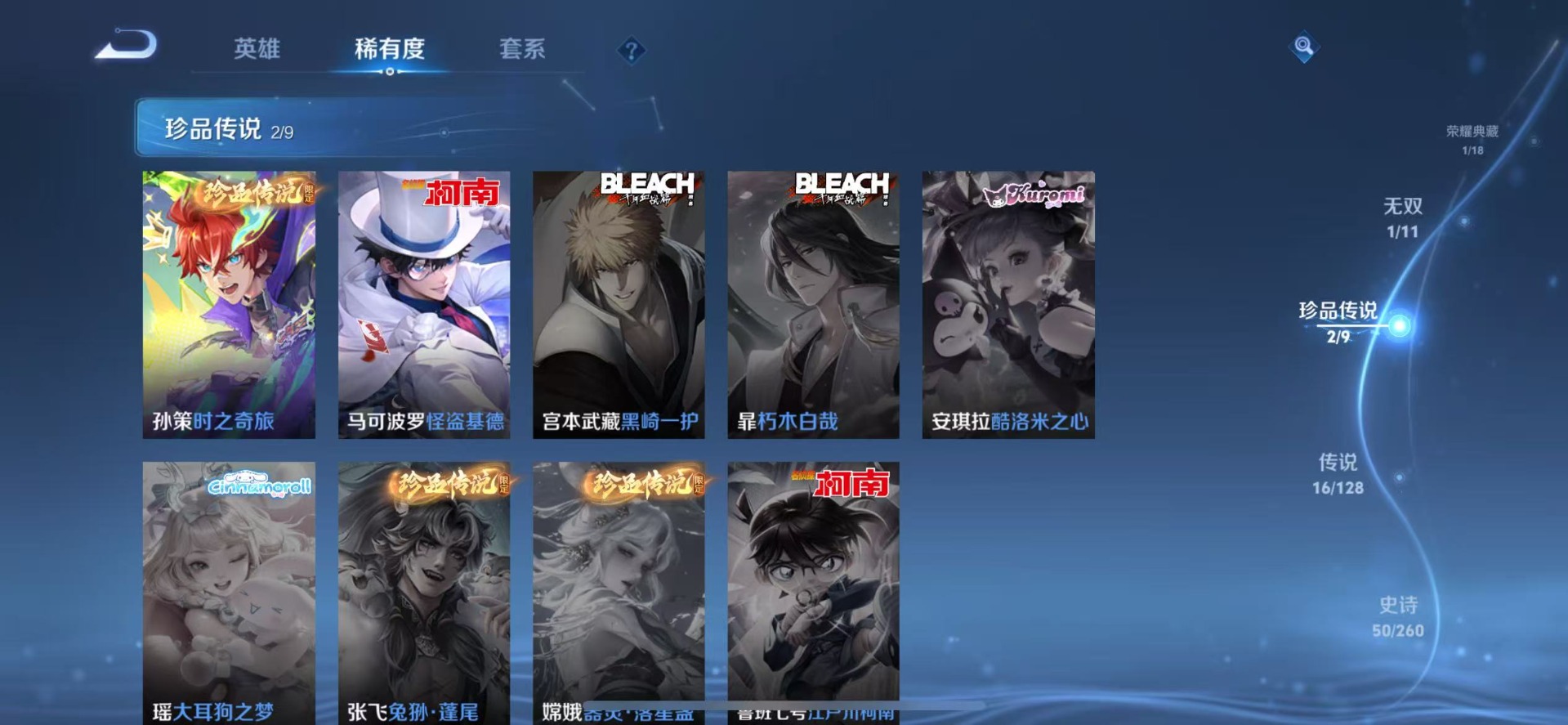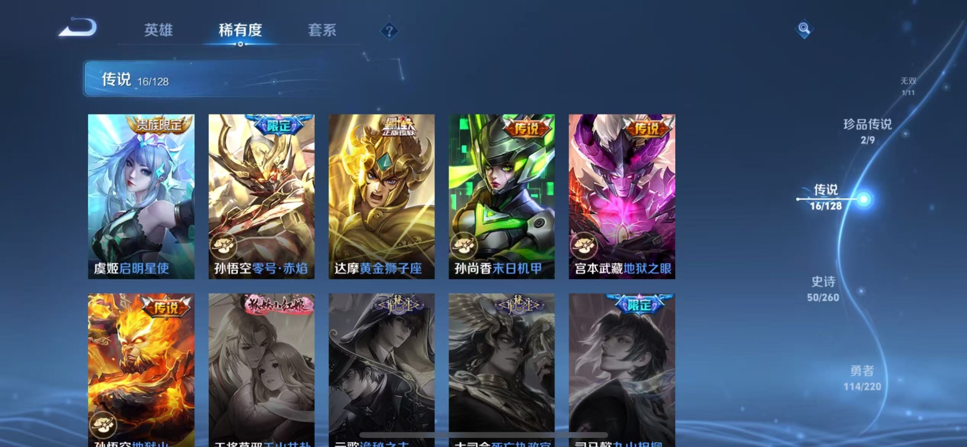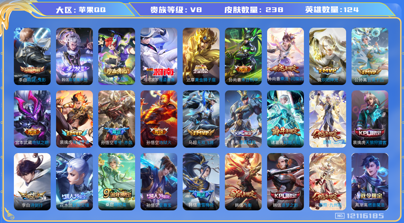 - PX_2081511-实名: 可修改 贵族等级: V7 英雄数: 123 皮肤数: 261 荣耀水晶: 幻阙歌 珍品传说: 黑崎一护 传说皮: 黄金狮子座,末日机甲-孙尚香,地狱之眼,超时空战士-狄仁杰,霜月吟 限定皮: 李小龙,游园惊梦,梁祝,时雨天司,引擎之心,神威,青春决赛季,逐梦之影,凤求凰,至尊宝,五谷丰年,愿照·山河定