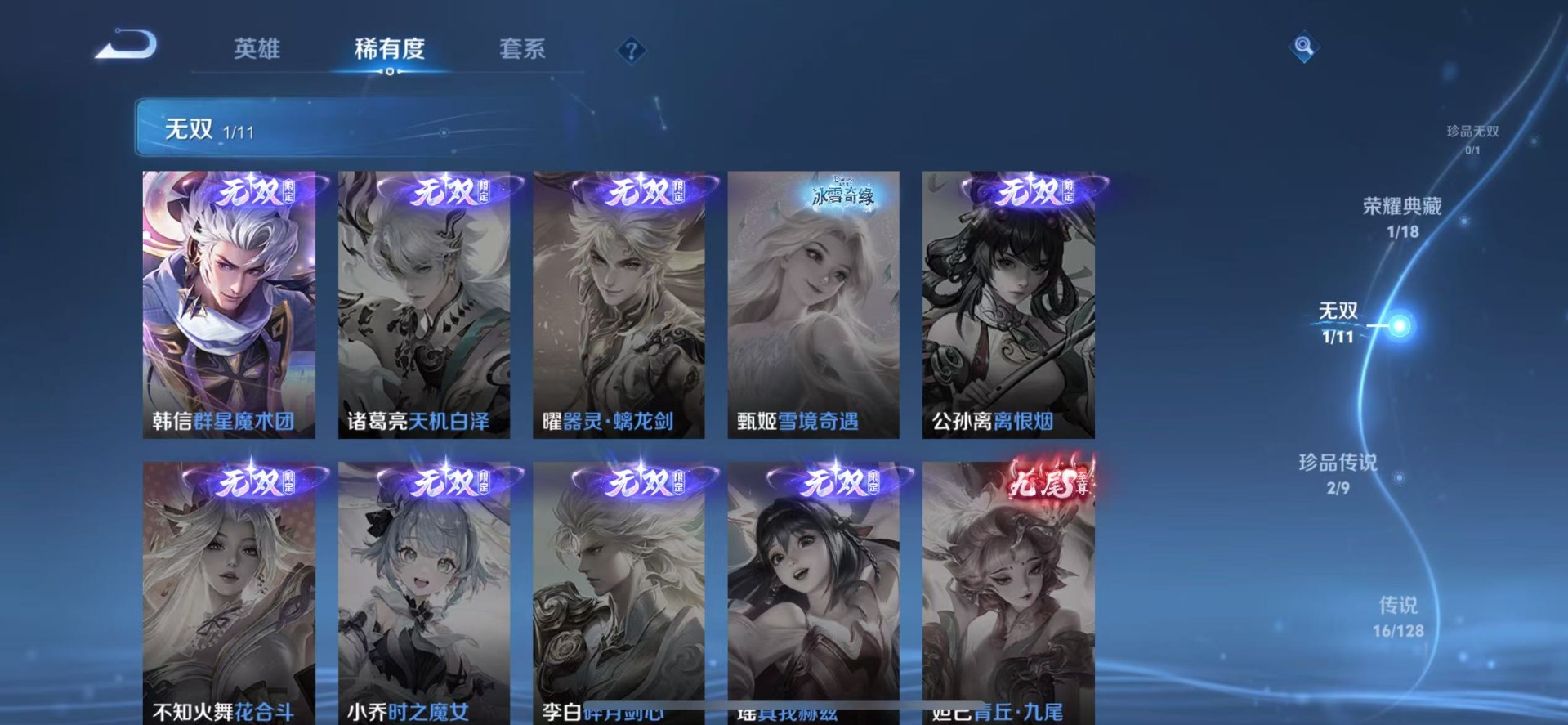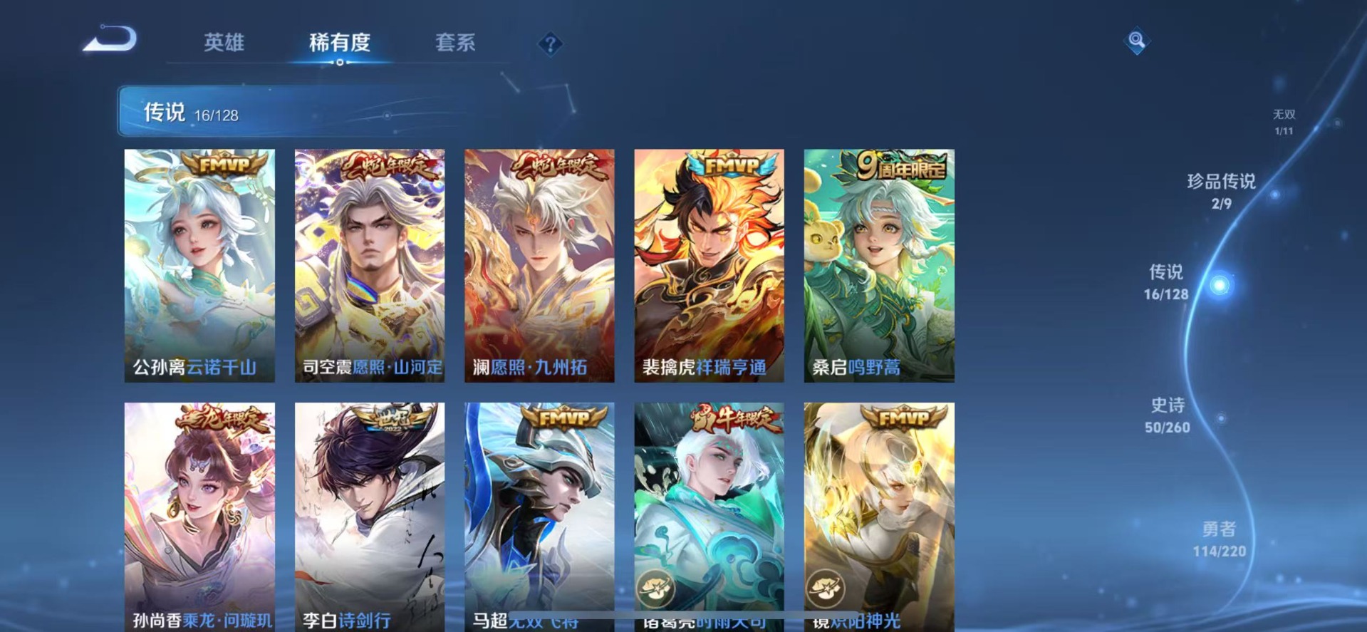 [12116185]V8 1典藏 1无双 2珍品传说 16传说 124英雄 238皮肤 可修改实名 优质装备:鸣剑·曳影,韩信群星魔术团(韩信无双),怪盗基德,黄金狮子座,炽阳神光,末日机甲-孙尚香(绿蚂蚱),地狱火,零号·赤焰,地狱之眼,无双飞将 珍品传说:时之奇旅-孙策 传说皮:乘龙·问璇玑(孙尚香年限),云诺千山,祥瑞亨通 珍宝阁皮:妄想食味 限定皮:愿照·九州拓(澜年限),愿照·山河定(司空震年限),逐霄战戟,鸣野蒿,至尊宝,傲雪梅枪,时雨天司(水龙头),飞衡(韩信年限),诗剑行,天狼狩猎者,逐梦之影,默契交锋-花木兰 史诗皮:鸭鸭历险记-刘禅,器灵·浮梦炉,化蝶舞,龙之律动,茶境仙,谪仙醉月,星界特工,破空之剑,怒海争锋,决胜骁骑,蔬乡物语(鲁班七号),幻珠鲛人,织梦人,紫霞仙子,白龙吟,黄金分割率,特工魅影,千年之狐,百解令(蒙犽),高渐离燃音魔法,偶像歌手,乱世虎臣,修罗,水果甜心,暗隐猎兽者,鬼剑武藏,天秀·启明,纤云弄巧,繁星吟游(呼啦呼啦),缤纷独角兽,乘风破浪,逐浪之夏,水晶猎龙者,曙光守护者,圣诞狂欢,鹰眼统帅,赏金猎手,未来纪元-赵云