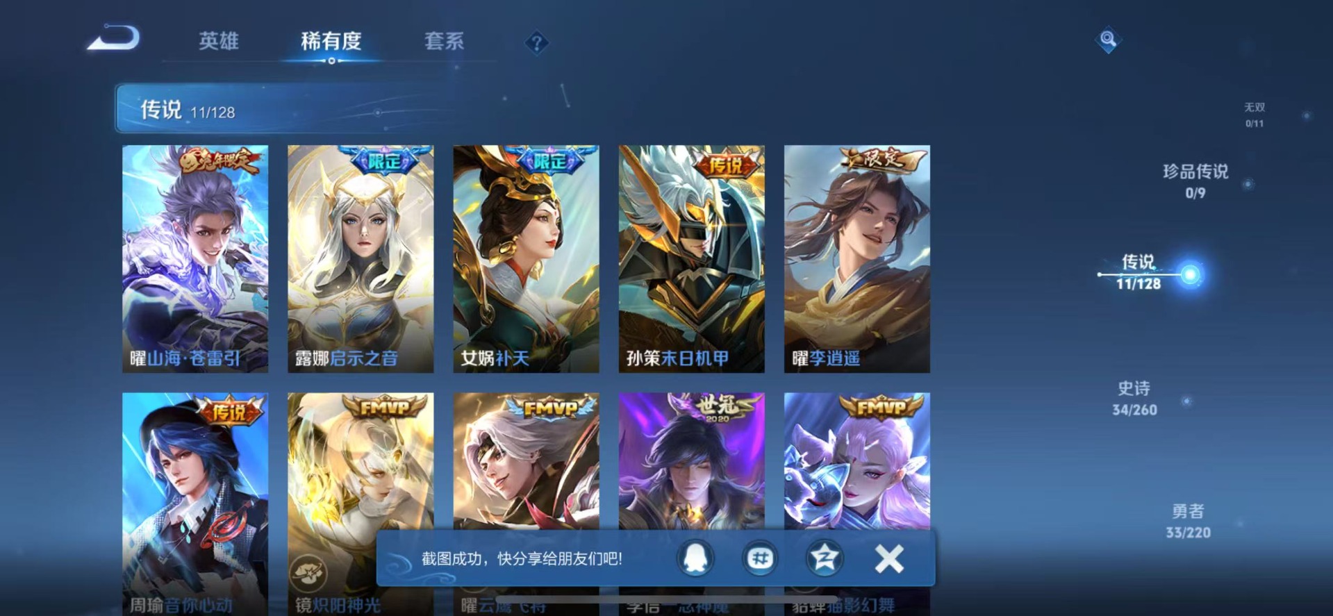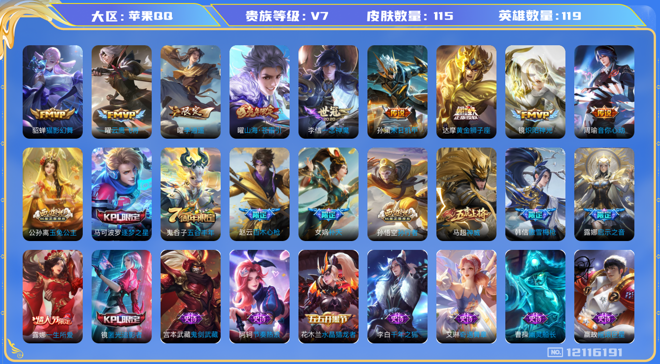 [12116191]V7 11传说 119英雄 115皮肤 可修改实名 优质装备:黄金狮子座,云鹰飞将(小将军),猫影幻舞,炽阳神光,一念神魔,音你心动-周瑜,李逍遥,末日机甲-孙策,山海·苍雷引(电光曜子) 珍宝阁皮:女武神 限定皮:傲雪梅枪,补天,神威(电光马子),五谷丰年,逐梦之星,孙行者,一生所爱,匿光追影者,百木心枪,玉兔公主,启示之音 史诗皮:特工魅影,千年之狐,魅语,末日机甲-吕布,节奏热浪,修罗,女仆咖啡,摇滚巨星,水果甜心,幽灵船长,鬼剑武藏,逐浪之夏,水晶猎龙者,金属风暴,原初追逐者,鹰眼统帅,黎明之约,赏金猎手,奇遇舞章,无心