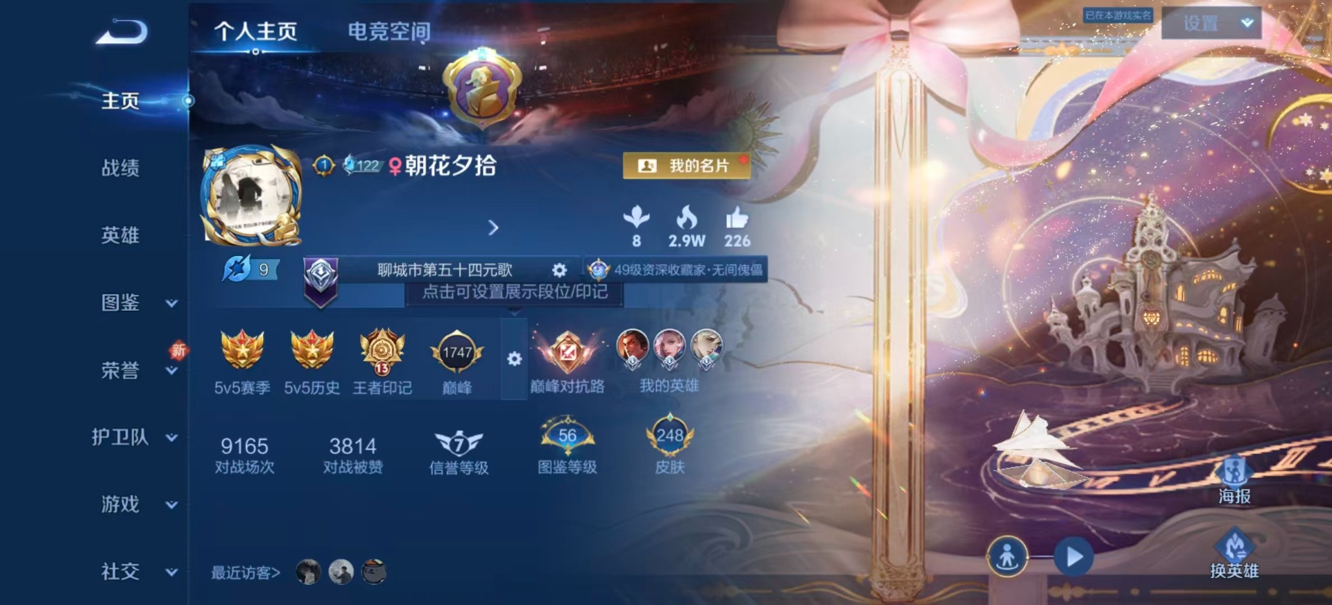 - [11884062]V7 1典藏 9传说 125英雄 235皮肤 可修改实名 优质装备:神鉴启示录,冠军飞将,炽阳神光,音你心动-小乔,胖达荣荣,大乔-时之奇旅 珍宝阁皮:蔷薇恋人,女武神 限定皮:凤凰于飞,星穹之声,白鹤梁神女,山海·碧波行(瑶年限),遇见飞天,诗剑行,无限倾心-虞姬,五谷丰年,梁祝,孙行者,乒乒小将,女儿国国王,时之祈愿-瑶(瑶传限),匿光启智者,时之奇旅-妲己,山海·玄木吟(马可年限) 史诗皮:化蝶舞,琥珀纪元伽罗,遇见神鹿,紫霞仙子,苍穹之光,黄金分割率,江河有灵,匿光侦查者,雪夜绮愿(周瑜),百解令(蒙犽),高渐离燃音魔法,蒙恬荣光圣徽,无限星赏官,匿光破解者,青蛇,晚萤,电玩·爆裂旋风,猫狗日记-孙策,时之恋人-孙尚香,乱世虎臣,女仆咖啡,水果甜心,天才门将,时之奇旅-安琪拉,功夫厨神,暗隐猎兽者,幽灵船长,鬼剑武藏,地狱岩魂,纤云弄巧,繁星吟游(呼啦呼啦),拒霜思,逐浪之夏,水晶猎龙者,曙光守护者,箭羽风息,金属风暴,圣诞狂欢,圣诞恋歌,鹰眼统帅,暗夜贵公子,魅力维加斯,奇遇舞章,天秀·音浪,无心