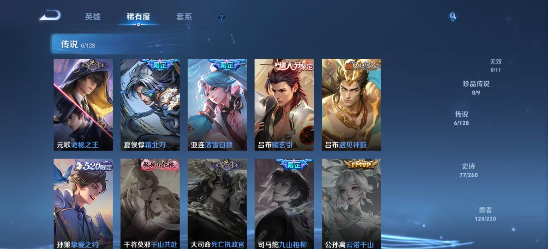 高渐离燃音魔法,海诺心动手记,刘邦德古拉伯爵,夏侯惇乘风破浪,阿轲暗夜猫娘,阿轲节奏热浪,刘备百相守梦,曹操幽灵船长,廉颇地狱岩魂,孙策猫狗日记,项羽苍穹之光,吕布圣诞狂欢,吕布末日机甲,诸葛亮黄金分割率,刘禅天才门将,刘禅绅士熊喵,宫本武藏鬼剑武藏,兰陵王暗隐猎兽者,貂蝉圣诞恋歌,花木兰水晶猎龙者,夏洛特永昼,安琪拉心灵骇客,杨戬天秀·启明,白起星夜王子,亚瑟心灵战警,嬴政摇滚巨星,嬴政暗夜贵公子,程咬金功夫厨神,百里玄策原初追逐者,雅典娜黎明之约,百里守约特工魅影,李元芳逐浪之夏,墨子金属风暴,蔡文姬舞动绿茵,王昭君偶像歌手,嫦娥拒霜思