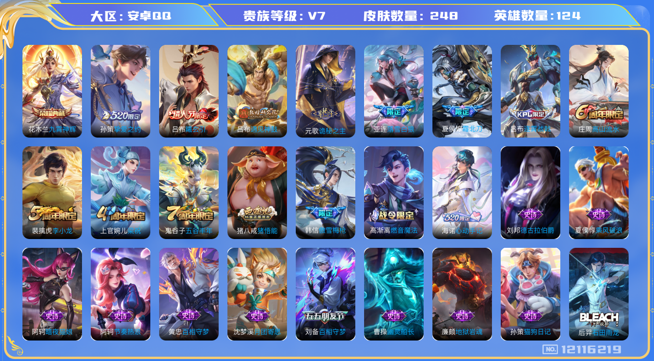 [12116219]V7 1典藏 6传说 124英雄 248皮肤 可修改实名 优质装备:九霄神辉(木兰典藏),挚爱之约,遇见神鼓,诡秘之主,涂山容容 传说皮:吕布曦玄引,落雪白狼 珍宝阁皮:妄想食味,玩趣恶龙 限定皮:逐霄战戟,夏侯惇霜北刀,傲雪梅枪,高山流水,五谷丰年,梁祝,李小龙,猪悟能 史诗皮:星界战将,石田雨龙,百相守梦-黄忠,破空之剑,海诺心动手记,蔬乡物语(鲁班七号),织梦人,苍穹之光,黄金分割率,特工魅影,永昼,江河有灵,高渐离燃音魔法,蒙恬荣光圣徽,偶像歌手,百相守梦(刘备),暗夜猫娘,末日机甲-吕布,猫狗日记-孙策,节奏热浪,女仆咖啡,摇滚巨星,水果甜心,绅士熊喵,天才门将,星夜王子,心灵骇客,功夫厨神,德古拉伯爵,暗隐猎兽者,幽灵船长,鬼剑武藏,心灵战警,天秀·启明,舞动绿茵,地狱岩魂,纤云弄巧,拒霜思,乘风破浪,逐浪之夏,月团寄思,水晶猎龙者,金属风暴,原初追逐者,圣诞狂欢,圣诞恋歌,鹰眼统帅,暗夜贵公子,魅力维加斯,黎明之约,无心,未来纪元-赵云