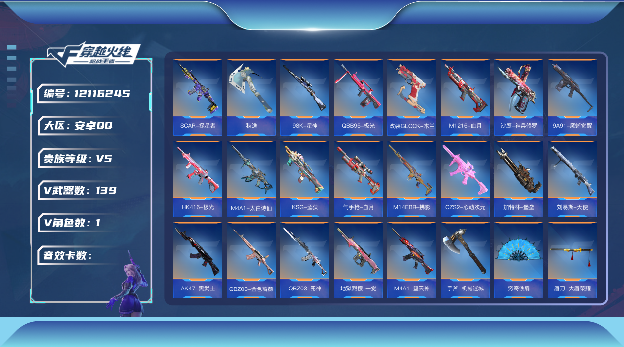 [12116245]可二次 可修改实名 V5 1王者武器 139英雄武器 1英雄角色 261万化 大师SS 武器:M200-幻神,TAC-慈,KSG-孟获,81式-光明之神,巴雷特-毁灭,M4A1-堕天神,M4A1-死神,M4A1-雷神,AK47-燎天净火,AK47-黑武士,M4A1-黑龙,M4A1-黑骑士,AK47-木兰,98K-黑骑士,QBZ19-天使,QBZ03-金色蔷薇,QBZ03-死神,AUG-机械纪元,刘易斯-天使,QBB95-极光,双持斯泰尔-天使,MK5-极光,M4A1-龙血,M4A1-运输船,M4A1-心动次元,AK47-猩红传说,AK47-心动次元,AK47-血武士,M200-心动次元觉醒,98K-星神,09式狙-天神,AWM-裁决,AWM-天龙,AK12-天启,SCAR-探星者,M4A1-夏清,CBJ-MS-毒蜂,加特林-堡垒,地狱火,地狱烈炎,CZS2-心动次元,AA12-火药觉醒,M1216-血月,地狱烈樱·一觉,MK47-鼓龙,M14EBR-拂影,AK47-破空冰刃,HK416-极光,9A91-魔蜥觉醒,AN94-赳赳秦师,M4A1-太白诗仙,墨刃-幻神,穷奇铁扇,双持柯尔特-极光,M16-恶魔,沙鹰-修罗,左轮-黑武士,改装GLOCK-木兰,气手枪-血月,沙鹰-神兵修罗,手斧-机械迷城,蝴蝶刀-极光,USP-太白诗仙,百战巾帼枪,马来剑-毁灭,尼泊尔-冰锋觉醒,斩魔剑-天使,M4A1-铁胆虎魄,擎天觉醒,血阳,神罚战斧,丛林匕首-庆龙觉醒,秋逸,麒麟刺,屠龙,唐刀-大唐荣耀,血月,斩魔刀,女皇利刃-铁胆虎魄,烟雾弹-雷霆,闪光弹-雷霆,高爆手雷-雷霆,黑骑士烟雾弹,黑骑士闪光弹,黑骑士手雷,幻兽烟雾弹,幻兽闪光弹,幻兽手雷,烟雾弹-游骑兵,闪光弹-游骑兵,燃烧弹-游骑兵,高爆手雷-无限,手雷-云海游龙,掠夺者P365-虹舞,DDM4-PDW-星际宇航觉醒,巴雷特-朱雀,AWM-指南针觉醒,QBZ97-浩瀚征途,烟雾弹-神工天巧,M14EBR-葫芦山庄,蟒蛇-鼓龙,双持沙鹰-元让,龙爪手-鼓龙,鹰爪-迷城红光觉醒,气勇胆烈戟,王者之竞手雷,高爆手雷-神工天巧,分裂雷-偃蛇,SCAR-心动PICK,思召剑,破邪蛇棍觉醒,马来剑-耀金伯爵,甩棍-卧龙觉醒,烟雾弹-星际宇航,G3A3-衍神兵,闪光弹-遁天梭-飞行,烟雾弹-遁天梭-重山盾,HK417-炎龙铠甲