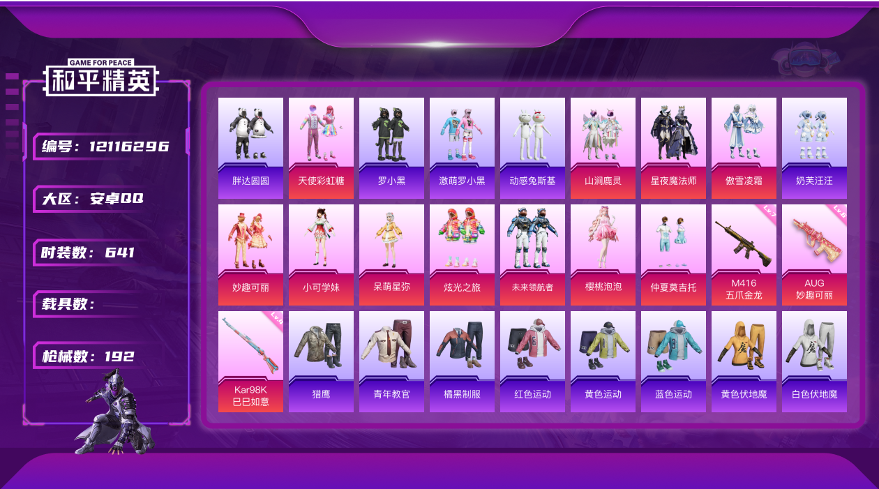 [12116296]11粉装 3特效枪 10印记 可二次 可修改实名 女号 身法装备:暗影哥特(红眼罩) 优质装备:M416五爪金龙,天使彩虹糖,AUG妙趣可丽,七级M416-五爪金龙,未来领航者,樱桃泡泡,Kar98K-巳巳如意 热门装扮:山涧鹿灵,妙趣可丽,傲雪凌霜,星夜魔法师,仲夏莫吉托,呆萌星弥,小可学妹,炫光之旅,动感兔斯基,胖达圆圆,奶芙汪汪,罗小黑,激萌罗小黑 六级特效枪:六级AUG-妙趣可丽 四级特效枪:四级Kar98K-巳巳如意 紫色装扮:田园牧歌,轻风白浪,和煦暖阳,SS22特训,飞狐塔尔斯,SS23特训,幻彩翩翩,灵蜜圈圈,妙红点点,香榭午后,娇憨猪猪,酸甜橘柚,奶油香芋,樱桃黑巧,萌趣咩咩,SS21特训,浪漫假日,SS31特训套装,人气偶像,六六大吉,冷焰舞者,SS30特训套装,SS33特训套装,青涩时光,SS20特训,青春冒险家,潮流游乐家,SS15特训,SS16特训,冰爽海盐,SS14特训,萌趣颜团子,猎梦纪元,飞驰魅影,音速流光,SS19特训,粉团憨憨,豚鼠丹丹,软羊咩咩,醇脆可可,香草威化,吉莉礼服,甜心亚梦,虚音幻奏,SS17特训,沁蓝冰爽,SS18特训,都市漫游者,都市魅力,酒红色名流,酷潮明星,野性战心,长空猛禽,霓虹街区,青年教官,荷畔雨呱,耀眼新星,荣耀,蓝彩潮人,蓝色守护者,蓝色运动,街头潮人,飞行日记,魅力单车,鹤鸣,麻辣教官,黄色伏地魔,黄色名流,黄色运动,黑色伏地魔,龙的传人,龟仙人,蝶变,极速红龙,柠萌假日,橘黑制服,涂山之恋,深蓝色名流,清新柠檬,幻影武者,夏日音浪,完美偶像,帅气教官,幻世战舞者,怒火燎原,战地督导,探宝勇士,湖蓝色名流,绮丽涂鸦,白熊同盟,白色伏地魔,破蛋小黄鸡,福星高照,空岛之星,竞技达人朋克,红色运动,甜蜜熊情侣,王牌教练,牛气冲天,灼焰舞者,炫蓝之夏,热血青春,牛气满满,猛禽,狂战萌兔,狂沙舞者,猎鹰,雏菊兔兔,萝兰蝴蝶,SS29特训,星途旅人,纯真浪花,热情海星,SS28特训,卖崽青蛙,粉雾星云,暗影刺翼,鱼渊荷华,玉兔迎春,燕燕于飞,青团波波,糖糖葫芦,竞技名士,摩登魅猫,暗影哥特(红眼罩),惊鸿侠骨,甜梦熊熊,神气柴柴,懵萌河马,SS24特训(SS24特训套装),绚紫流光,SS25特训,皇家花园,绝对偶像,金戈铁马,锦衣飞扬,粉红小猪,焰鹰斗篷,幻羽潜行,幽夜迷踪,SS27特训