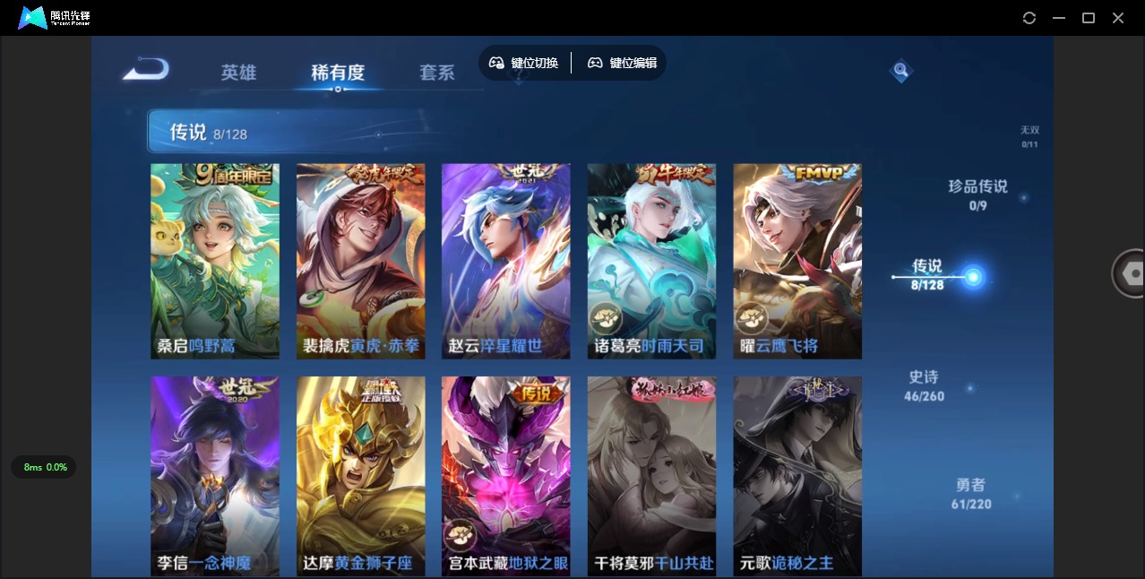 - PX_2090692-68 安卓QQ/至尊星耀/341皮肤/125英雄/2典藏/0珍品无双/0无双/1珍品传说/18传说/104史诗/9稀有英雄 【1 珍品传说】怪盗基德 马可波罗, 【2 典藏皮肤】全息碎影 孙悟空,赤影疾锋 关羽, 【18 传说皮肤】枫霜尽 橘右京,启明星使 虞姬,逐花归海 澜,云鹰飞将 曜,地狱之眼 宫本武藏,音你心动 周瑜,炽阳神光 镜,乞巧织情 王昭君,时之恋人 刘备,久