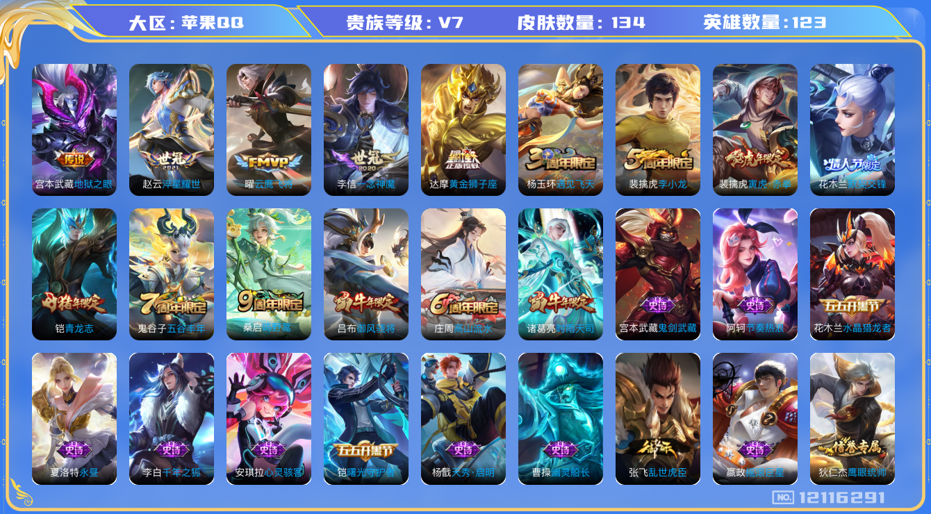 [12116291]V7 8传说 123英雄 134皮肤 可修改实名 女号 优质装备:黄金狮子座,云鹰飞将(小将军),一念神魔,地狱之眼,淬星耀世 珍宝阁皮:蔷薇恋人 限定皮:鸣野蒿,时雨天司(水龙头),遇见飞天,高山流水,五谷丰年,青龙志(铠年限),御风骁将(吕布年限),李小龙,默契交锋-花木兰,寅虎·赤拳(老虎年限) 史诗皮:龙之律动,星界战将,百相守梦-周瑜,电玩小子(小书包),千年之狐,永昼,蒙恬荣光圣徽,晚萤,猫狗日记-孙策,乱世虎臣,节奏热浪,修罗,摇滚巨星,水果甜心,天才门将,心灵骇客,幽灵船长,鬼剑武藏,天秀·启明,舞动绿茵,纤云弄巧,缤纷独角兽,水晶猎龙者,曙光守护者,金属风暴,原初追逐者,圣诞狂欢,鹰眼统帅,魅力维加斯,黎明之约,未来纪元-赵云
