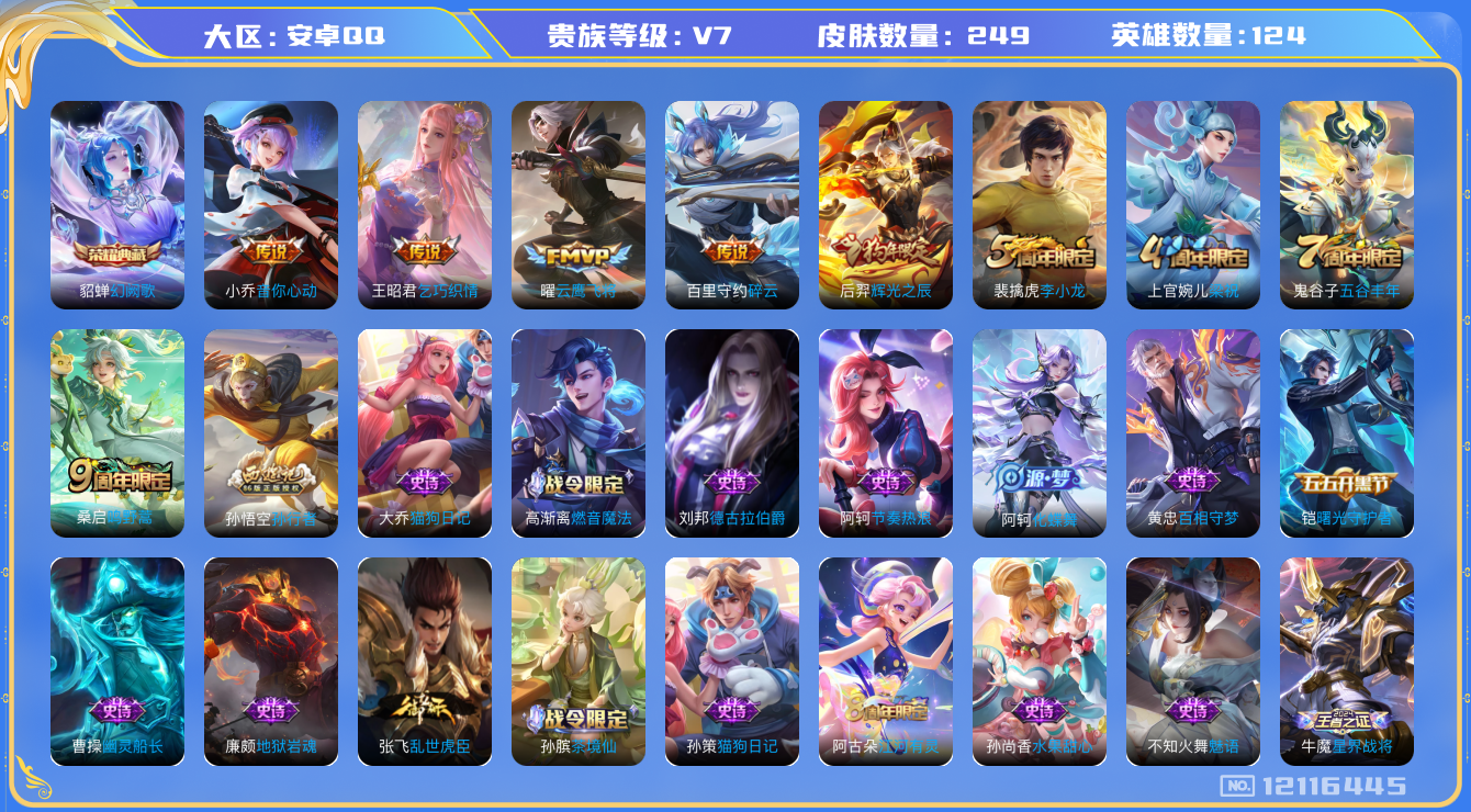 [12116445]V7 1典藏 5传说 124英雄 249皮肤 可修改实名 优质装备:幻阙歌(貂蝉典藏),云鹰飞将(小将军),音你心动-小乔,乞巧织情,碎云,涂山容容 珍宝阁皮:胡桃夹子 限定皮:鸣野蒿,五谷丰年,梁祝,李小龙,辉光之辰,孙行者 史诗皮:化蝶舞,星界战将,茶境仙,百相守梦-黄忠,破空之剑,蔬乡物语(鲁班七号),黄金分割率,特工魅影,千年之狐,永昼,江河有灵,百解令(蒙犽),高渐离燃音魔法,蒙恬荣光圣徽,魅语,偶像歌手,猫狗日记-孙策,猫狗日记-大乔,乱世虎臣,节奏热浪,女仆咖啡,摇滚巨星,水果甜心,绅士熊喵,心灵骇客,功夫厨神,德古拉伯爵,幽灵船长,鬼剑武藏,心灵战警,乐园奇幻夜,舞动绿茵,地狱岩魂,纤云弄巧,拒霜思,水晶猎龙者,曙光守护者,圣诞恋歌,鹰眼统帅,魅力维加斯,无心,未来纪元-赵云