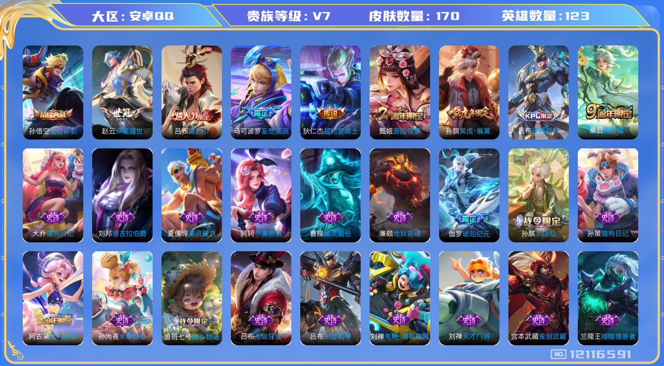 [12116591]V7 1典藏 5传说 123英雄 170皮肤 可修改实名 优质装备:全息碎影(猴子典藏),淬星耀世,超时空战士-狄仁杰,妄想实况 传说皮:吕布曦玄引 珍宝阁皮:玩趣恶龙 限定皮:逐霄战戟,鸣野蒿,寅虎·展翼(孙膑年限),游园惊梦 史诗皮:灵蛊蚀心,龙之律动,雪豹·霜爪,茶境仙,破空之剑,琥珀纪元伽罗,蔬乡物语(鲁班七号),百相守梦-百里守约,织梦人,江河有灵,蒙恬荣光圣徽,偶像歌手,电玩·爆裂旋风,龙骑士(小龙虾),末日机甲-吕布,猫狗日记-孙策,猫狗日记-大乔,节奏热浪,女仆咖啡,水果甜心,天才门将,星夜王子,心灵骇客,功夫厨神,德古拉伯爵,暗隐猎兽者,幽灵船长,鬼剑武藏,天秀·启明,地狱岩魂,纤云弄巧,拒霜思,乘风破浪,水晶猎龙者,金属风暴,圣诞狂欢,圣诞恋歌,鹰眼统帅,魅力维加斯,赏金猎手