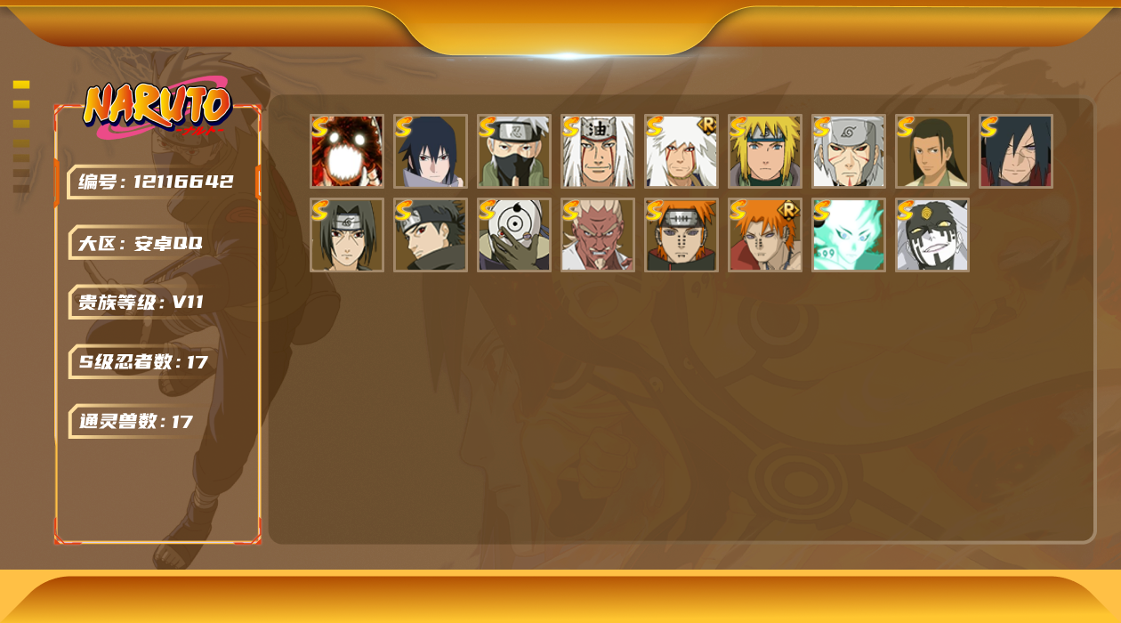 [12116642]V11 17S忍 32A忍 17通灵 715.3W战力 可二次 可修改实名 优质装备:熊猫,佩恩·天道「超」,千手扉间「秽土转生」,“宇智波斑” 「白面具」,宇智波佐助「永恒万花筒」,千手柱间·木叶创立,宇智波斑「秽土转生·解」,大筒木桃式,艾「忍界大战」,宇智波止水「须佐能乎」,旗木卡卡西「须佐能乎」,大筒木舍人 「最终章」,漩涡鸣人 「暴怒·第六尾」 S级忍者:自来也 「舞之豪杰」,宇智波鼬 「须佐能乎」,佩恩「天道」,波风水门,自来也