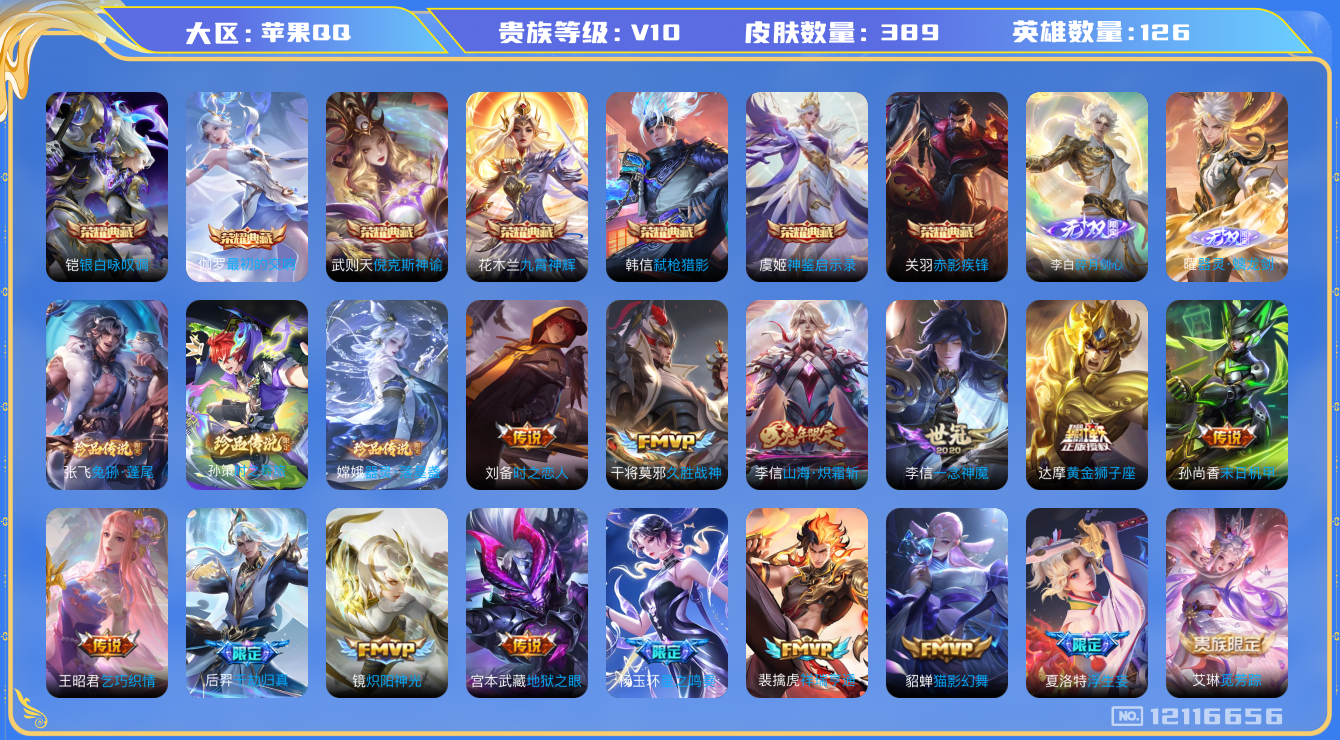 - PX_2095753-实名: 可修改 贵族等级: V7 英雄数: 123 皮肤数: 188 传说皮: 冠军飞将,炽阳神光,末日机甲-孙尚香,地狱火,地狱之眼,胖达荣荣,超时空战士-狄仁杰,山海·炽霜斩,山海·苍雷引,电玩·雷克斯 限定皮: 李小龙,引擎之心,白虎志,青龙志,瑞麟志,玄武志,朱雀志,一生所爱,大圣娶亲,五谷丰年,山海·玄木吟