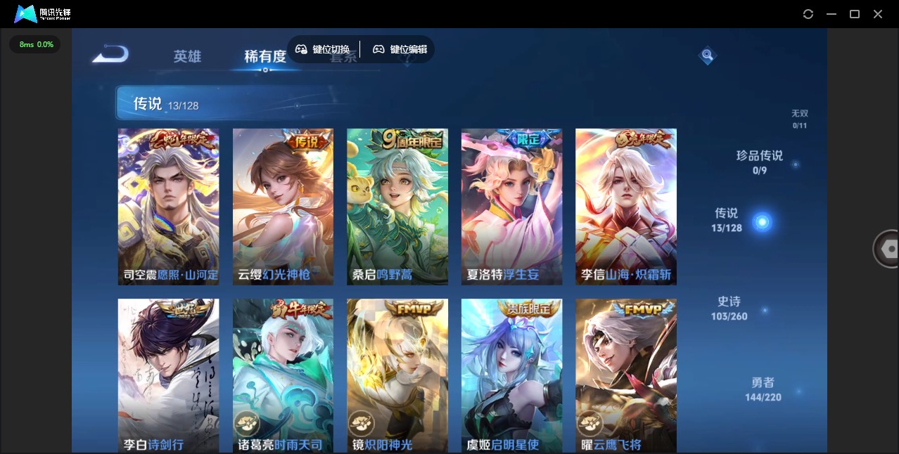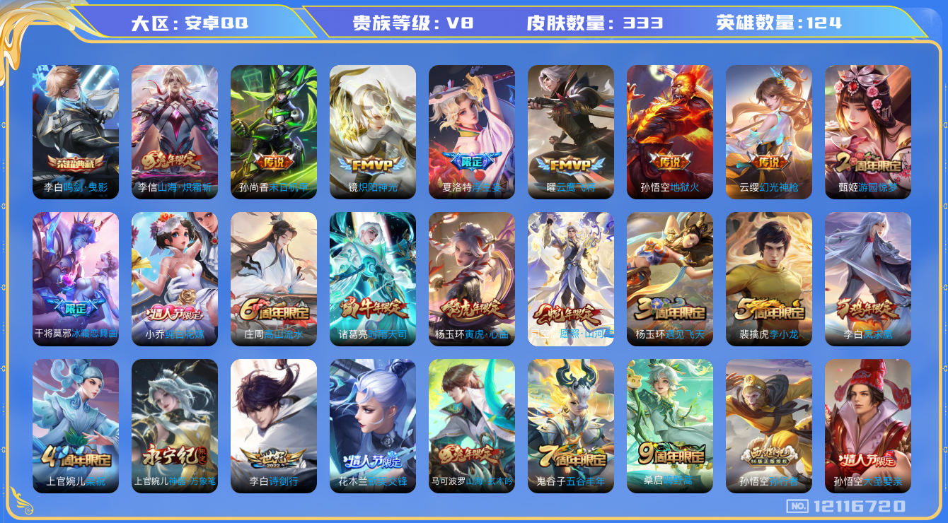 [12116720]V8 1典藏 13传说 124英雄 333皮肤 可修改实名 优质装备:鸣剑·曳影,云鹰飞将(小将军),炽阳神光,末日机甲-孙尚香(绿蚂蚱),地狱火,山海·炽霜斩(李信年限),浮生妄 传说皮:幻光神枪 珍宝阁皮:妄想食味,优雅恋人,蔷薇恋人,女武神 限定皮:愿照·山河定(司空震年限),鸣野蒿,至尊宝,凤求凰(白切鸡),时雨天司(水龙头),遇见飞天,高山流水,诗剑行,五谷丰年,游园惊梦,梁祝,李小龙,逐梦之影,朱雀志(守约年限),霸王别姬-虞姬,默契交锋-花木兰,纯白花嫁,孙行者,大圣娶亲,冰霜恋舞曲,寅虎·心曲(虎婆),神器·万象笔,山海·玄木吟(马可年限) 史诗皮:化蝶舞,琥珀纪元伽罗,星界战将,百相守梦-黄忠,破空之剑,怒海争锋,海诺心动手记,遇见神鹿,紫霞仙子,电玩小子(小书包),黄金分割率,特工魅影,千年之狐,冰冠公主,江河有灵,青蛇,蒙恬荣光圣徽,魅语,电玩·爆裂旋风,偶像歌手,银翎春语,龙骑士(小龙虾),暗夜猫娘,末日机甲-吕布,猫狗日记-孙策,猫狗日记-大乔,乱世虎臣,节奏热浪,修罗,女仆咖啡,摇滚巨星,水果甜心,天才门将,星夜王子,心灵骇客,功夫厨神,德古拉伯爵,暗隐猎兽者,幽灵船长,鬼剑武藏,心灵战警,天秀·启明,地狱岩魂,纤云弄巧,拒霜思,缤纷独角兽,乘风破浪,逐浪之夏,水晶猎龙者,曙光守护者,箭羽风息,金属风暴,原初追逐者,圣诞狂欢,圣诞恋歌,鹰眼统帅,王者之锤,暗夜贵公子,魅力维加斯,黎明之约,赏金猎手,无心,未来纪元-赵云,玫瑰异探