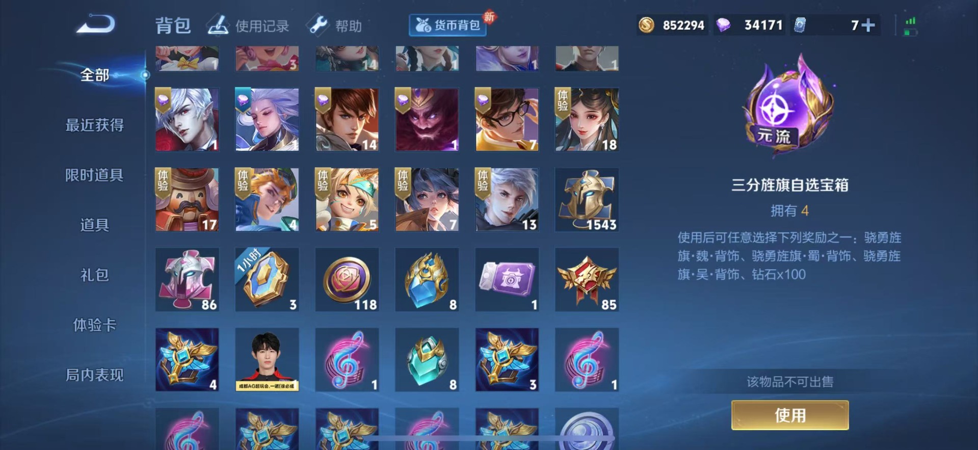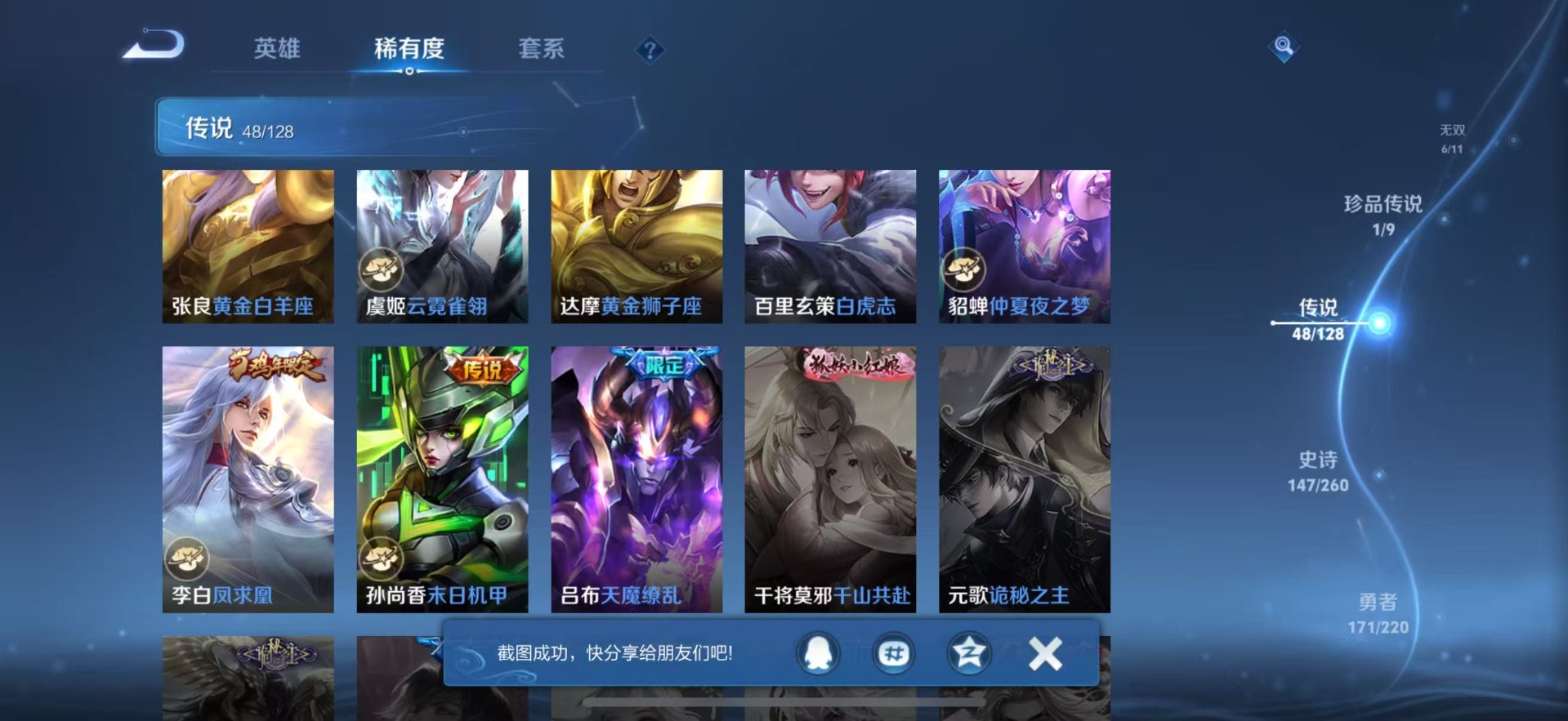 - [11912737]V7 1典藏 7传说 125英雄 303皮肤 可修改实名 优质装备:鸣剑·曳影,黄金射手座,黄金白羊座,久胜战神,炽阳神光,仲夏夜之梦(大飞蛾),涂山容容 珍宝阁皮:优雅恋人,蔷薇恋人,女武神 限定皮:愿照·九州拓(澜年限),逐霄战戟,鸣野蒿,至尊宝,五谷丰年,冰锋战神,梁祝,龙胆,李小龙,逐梦之影,孙行者,大圣娶亲 史诗皮:鸭鸭历险记-刘禅,灵蛊蚀心,星界战将,龙之律动,石田雨龙,蒙犽顽岩魄,琥珀纪元伽罗,紫霞仙子,电玩小子(小书包),白龙吟,黄金分割率,特工魅影,千年之狐,江河有灵,百解令(蒙犽),蒙恬荣光圣徽,冰冠公主,偶像歌手,电玩·爆裂旋风,末日机甲-吕布,猫狗日记-孙策,猫狗日记-大乔,节奏热浪,女仆咖啡,水果甜心,绅士熊喵,天才门将,星夜王子,心灵骇客,功夫厨神,德古拉伯爵,暗隐猎兽者,幽灵船长,鬼剑武藏,心灵战警,天秀·启明,舞动绿茵,地狱岩魂,诗语江南,纤云弄巧,繁星吟游(呼啦呼啦),拒霜思,缤纷独角兽,乘风破浪,逐浪之夏,水晶猎龙者,曙光守护者,箭羽风息,金属风暴,原初追逐者,圣诞狂欢,圣诞恋歌,鹰眼统帅,无心,未来纪元-赵云