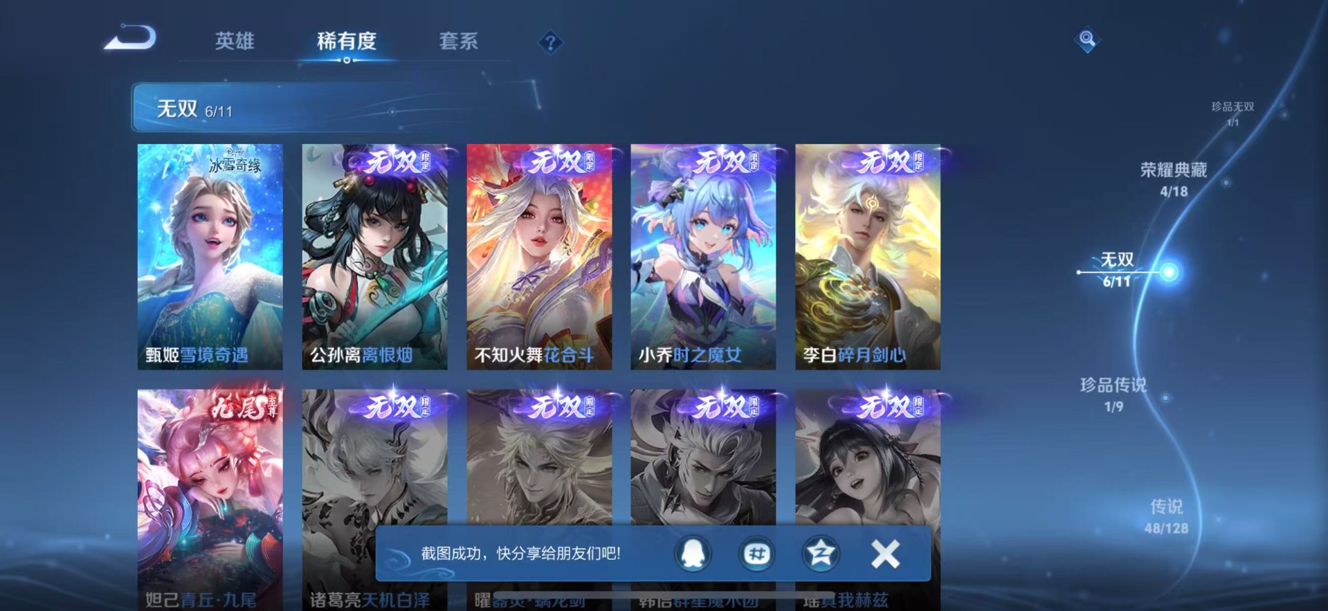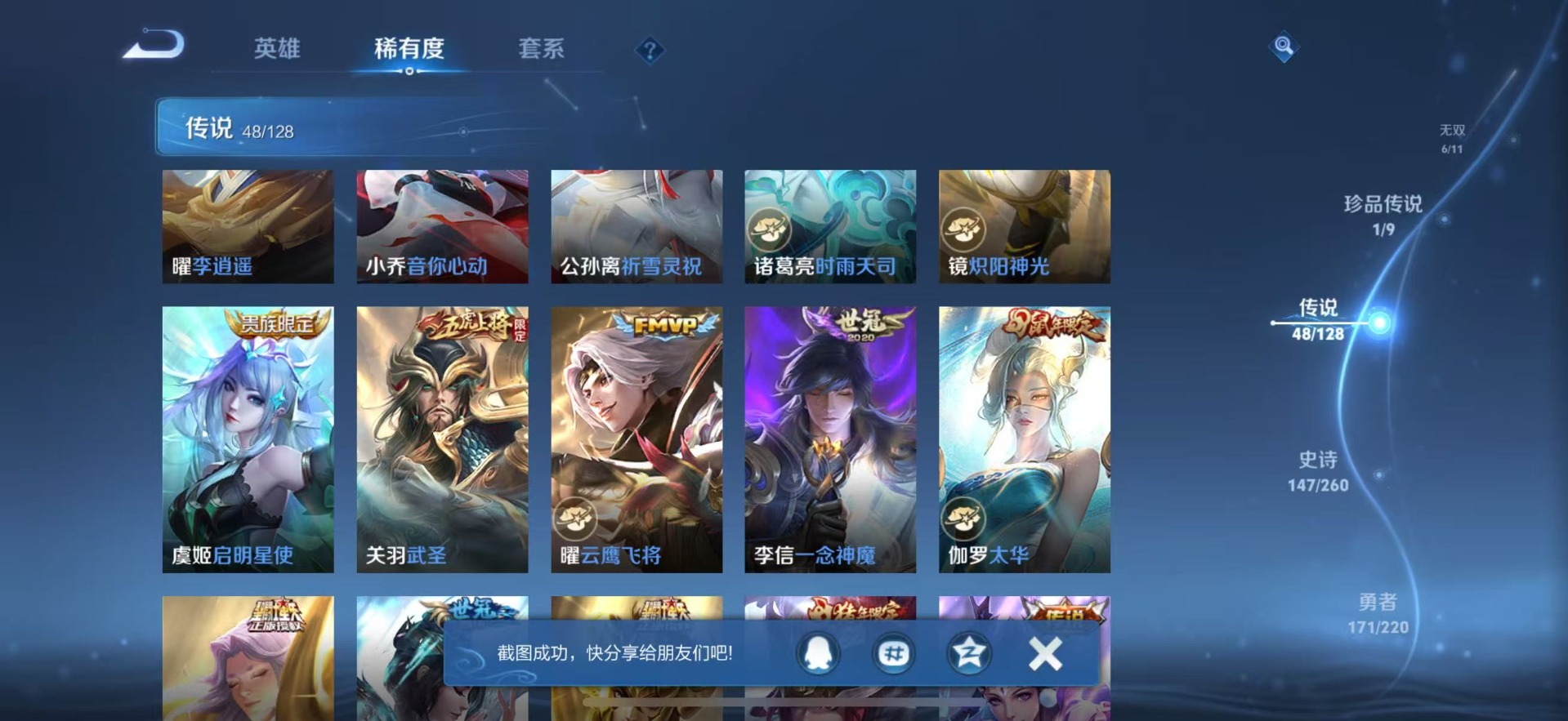 - [11602516]V6 1典藏 5传说 124英雄 180皮肤 可修改实名 优质装备:弑枪猎影(韩信典藏),地狱火,零号·赤焰 传说皮:幻光神枪 珍宝阁皮:妄想食味,蔷薇恋人 限定皮:愿照·九州拓(澜年限),鸣野蒿,高山流水,梁祝,御风骁将(吕布年限),李小龙 史诗皮:器灵·浮梦炉,化蝶舞,百相守梦-黄忠,特工魅影,暗夜猫娘,魅语,猫狗日记-孙策,乱世虎臣,节奏热浪,摇滚巨星,水果甜心,绅士熊喵,星夜王子,心灵骇客,功夫厨神,德古拉伯爵,暗隐猎兽者,幽灵船长,鬼剑武藏,纤云弄巧,繁星吟游(呼啦呼啦),缤纷独角兽,乘风破浪,水晶猎龙者,圣诞狂欢,圣诞恋歌,鹰眼统帅,魅力维加斯,未来纪元-赵云