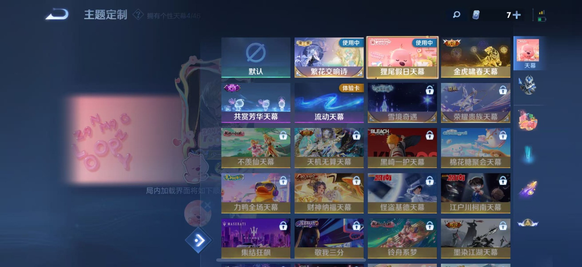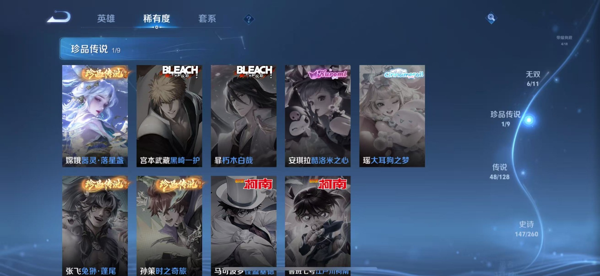 大乔猫狗日记,高渐离燃音魔法,大乔乘龙·忆丹青,海诺心动手记,刘邦德古拉伯爵,夏侯惇乘风破浪,阿轲暗夜猫娘,阿轲节奏热浪,铠曙光守护者,曹操幽灵船长,伽罗箭羽风息,廉颇地狱岩魂,伽罗琥珀纪元,小乔缤纷独角兽,小乔青蛇,孙策猫狗日记,不知火舞魅语,海月浮梦罗烟,赵怀真器灵·浮梦炉,鲁班七号电玩小子,项羽苍穹之光,吕布圣诞狂欢,吕布末日机甲,露娜紫霞仙子,诸葛亮黄金分割率,刘禅电玩·爆裂旋风,司马懿暗渊魔法,刘禅天才门将,刘禅绅士熊喵,宫本武藏鬼剑武藏,杨玉环银翎春语,公孙离无限星赏官,兰陵王暗隐猎兽者,貂蝉圣诞恋歌,花木兰水晶猎龙者,夏洛特永昼,李白千年之狐,安琪拉心灵骇客,蒙犽龙鼓争鸣,安琪拉乘龙·聚宝船,安琪拉时之奇旅,艾琳奇遇舞章,杨戬天秀·启明,西施诗语江南,白起星夜王子,亚瑟心灵战警,嬴政摇滚巨星,嬴政暗夜贵公子,桑启奇遇星旅,程咬金功夫厨神,百里玄策原初追逐者,雅典娜冰冠公主,雅典娜黎明之约,韩信白龙吟,李元芳逐浪之夏,百里守约特工魅影,墨子龙骑士,墨子金属风暴,蔡文姬舞动绿茵,澜赏金猎手,弈星滕王阁序,娜可露露晚萤,王昭君偶像歌手,嫦娥拒霜思,橘右京修罗