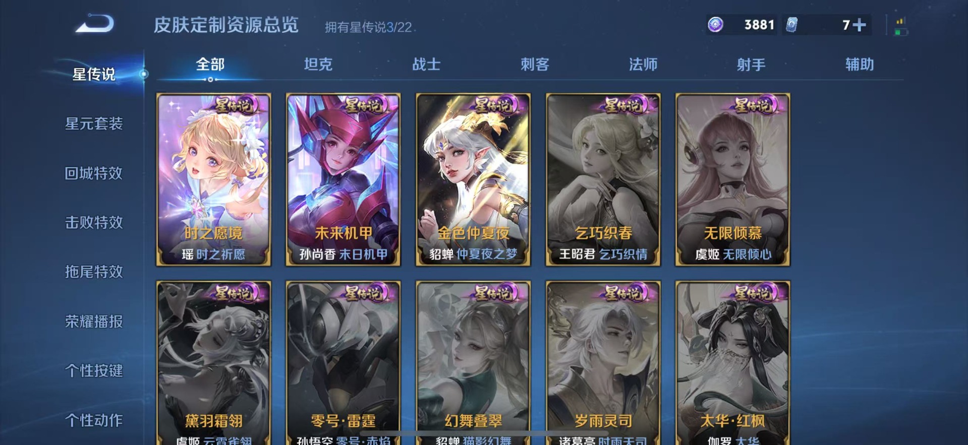 大乔挚爱花嫁,赵云淬星耀世,小乔音你心动,李信一念神魔,孙策末日机甲,孙策挚爱之约,达摩黄金狮子座,孙尚香乘龙·问璇玑,海月金乌负日,王昭君乞巧织情,露娜霜月吟,镜炽阳神光,朵莉亚心动手记,杨玉环星之鸣奏,公孙离记忆之芯,艾琳觅芳踪,西施游龙清影,西施续相思,张良黄金白羊座,曜云鹰飞将,曜李逍遥,马超无双飞将,虞姬云霓雀翎,貂蝉曦玄引