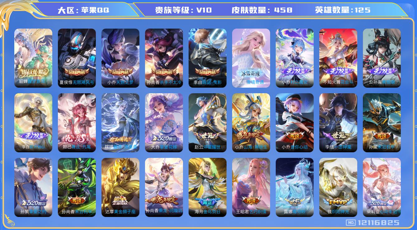 [12116825]V10 4典藏 1珍品无双 6无双 1珍品传说 48传说 125英雄 458皮肤 可修改实名 优质装备:馥梦繁花,天鹅之梦(小乔典藏),无限飓风号(高达),杀手不太冷,鸣剑·曳影,青丘·九尾(妲己无双),碎月剑心(李白无双),小乔时之魔女(小乔无双),花合斗,离恨烟(公孙离无双),雪境奇遇-甄姬,器灵·落星盏,黄金狮子座,云鹰飞将(小将军),黄金白羊座,炽阳神光,一念神魔,云霓雀翎,末日机甲-孙尚香(绿蚂蚱),仲夏夜之梦(大飞蛾),音你心动-小乔,李逍遥,乞巧织情,游龙清影(小青龙),淬星耀世,末日机甲-孙策,挚爱之约,挚爱花嫁,无双飞将,山海·琳琅生(小乔年限),记忆之芯(机甲兔),青丘·九尾,霜月吟,艾琳觅芳踪,金乌负日,朵莉亚心动手记,涂山容容 传说皮:乘龙·问璇玑(孙尚香年限),貂蝉曦玄引,续相思,星之鸣奏 珍宝阁皮:蔷薇恋人,女武神,玩趣恶龙 限定皮:愿照·千秋盛(女娲年限),映山客,鸣野蒿,白虎志(电光耗子),凤求凰(白切鸡),太华(伽罗年限),傲雪梅枪,补天,寅虎·展翼(孙膑年限),白鹤梁神女,白晶晶,时雨天司(水龙头),神威(电光马子),飞衡(韩信年限),至美·乘鲤谣,至美·化雀舞,遇见飞天,高山流水,诗剑行,匿光决锋者,怒海麟威,降魔,五谷丰年,青龙志(铠年限),冰锋战神,武圣,天狼运算者,游园惊梦,御风骁将(吕布年限),逐梦之星,天狼溯光者,祈雪灵祝(雪兔子),天狼绘梦者,李小龙,逐梦之影,默契交锋-花木兰,真爱至上,孙行者,一生所爱,引擎之心,天魔缭乱,青春决赛季,冰霜恋舞曲,乒乒小将,匿光追影者,女儿国国王,寅虎·御盾(廉颇年限),寅虎·瑞焰(虎皮蛋子),寅虎·心曲(虎婆),寅虎·赤拳(老虎年限),时之祈愿-云中君,时之祈愿-瑶(瑶传限),玉兔公主,启示之音,深海之息(深海大菠萝),枫霜尽 史诗皮:器灵·浮梦炉,化蝶舞,龙之律动,灵蛊蚀心,琥珀纪元伽罗,星界战将,百相守梦-周瑜,茶境仙,乘龙·忆丹青(大乔年限),百相守梦-黄忠,涂山红红,蒙犽顽岩魄,乘龙·聚宝船(安琪拉年限),海诺心动手记,奇遇星旅,守夜人,织梦人,紫霞仙子,苍穹之光,电玩小子(小书包),白龙吟,黄金分割率,特工魅影,千年之狐,永昼,冰冠公主,浮梦罗烟,青蛇,高渐离燃音魔法,蒙恬荣光圣徽,魅语,电玩·爆裂旋风,无限星赏官,晚萤,偶像歌手,银翎春语,龙骑士(小龙虾),暗夜