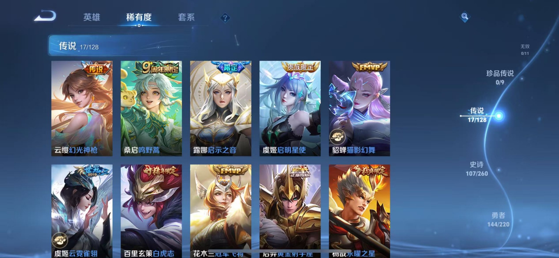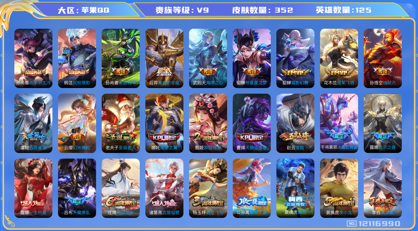 [12116990]V9 2典藏 17传说 125英雄 352皮肤 典藏英雄武则天 可修改实名 优质装备:杀手不太冷,弑枪猎影(韩信典藏),黄金射手座,冠军飞将,猫影幻舞,云霓雀翎,末日机甲-孙尚香(绿蚂蚱),地狱火,仲夏夜之梦(大飞蛾),海洋之心,涂山容容 传说皮:幻光神枪 珍宝阁皮:妄想食味 限定皮:鸣野蒿,白虎志(电光耗子),凤求凰(白切鸡),凤凰于飞,梅西,武陵仙君(小桃花),神威(电光马子),飞衡(韩信年限),遇见飞天,高山流水,冰锋战神,游园惊梦,梁祝,龙胆,逐梦之翼,天狼征服者,李小龙,朱雀志(守约年限),永曜之星,圣诞老人,孙行者,猪悟能,一生所爱,引擎之心,天魔缭乱,青春决赛季,冰霜恋舞曲,蜜橘之夏,热情桑巴,启示之音 史诗皮:琥珀纪元伽罗,星界战将,茶境仙,百相守梦-黄忠,芈月浮光幕影,百相守梦-百里守约,紫霞仙子,电玩小子(小书包),白龙吟,黄金分割率,特工魅影,千年之狐,永昼,冰冠公主,真我赫兹(镜),江河有灵,青蛇,高渐离燃音魔法,蒙恬荣光圣徽,魅语,无限星赏官,偶像歌手,龙骑士(小龙虾),暗夜猫娘,末日机甲-吕布,猫狗日记-孙策,猫狗日记-大乔,乱世虎臣,节奏热浪,修罗,女仆咖啡,摇滚巨星,水果甜心,绅士熊喵,天才门将,星夜王子,心灵骇客,时之奇旅-安琪拉,功夫厨神,德古拉伯爵,暗隐猎兽者,幽灵船长,鬼剑武藏,心灵战警,天秀·启明,舞动绿茵,地狱岩魂,诗语江南,繁星吟游(呼啦呼啦),拒霜思,缤纷独角兽,乘风破浪,逐浪之夏,水晶猎龙者,曙光守护者,箭羽风息,金属风暴,原初追逐者,圣诞狂欢,圣诞恋歌,鹰眼统帅,王者之锤,暗夜贵公子,魅力维加斯,黎明之约,未来纪元-赵云