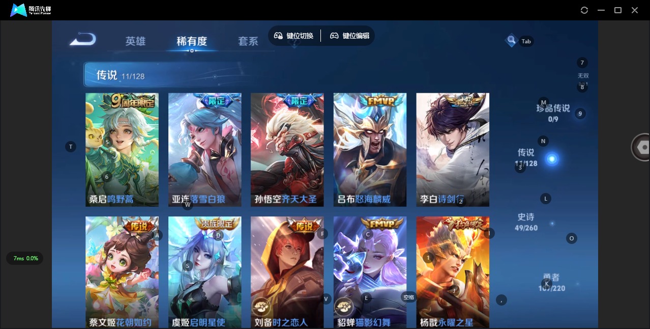- [11772081]V6 7传说 107英雄 84皮肤 可修改实名 优质装备:黄金射手座 传说皮:九山相柳,云诺千山 限定皮:愿照·九州拓(澜年限),愿照·岁时盈(虞姬年限),逐霄战戟,陌上桑,鸣野蒿,无尽星芒 史诗皮:赞萌露比,器灵·浮梦炉,化蝶舞,谪仙醉月,龙之律动,石田雨龙,百相守梦-百里守约,百相守梦-黄忠,猫狗日记-孙策,水果甜心,鬼剑武藏,逐浪之夏,箭羽风息,鹰眼统帅,魅力维加斯