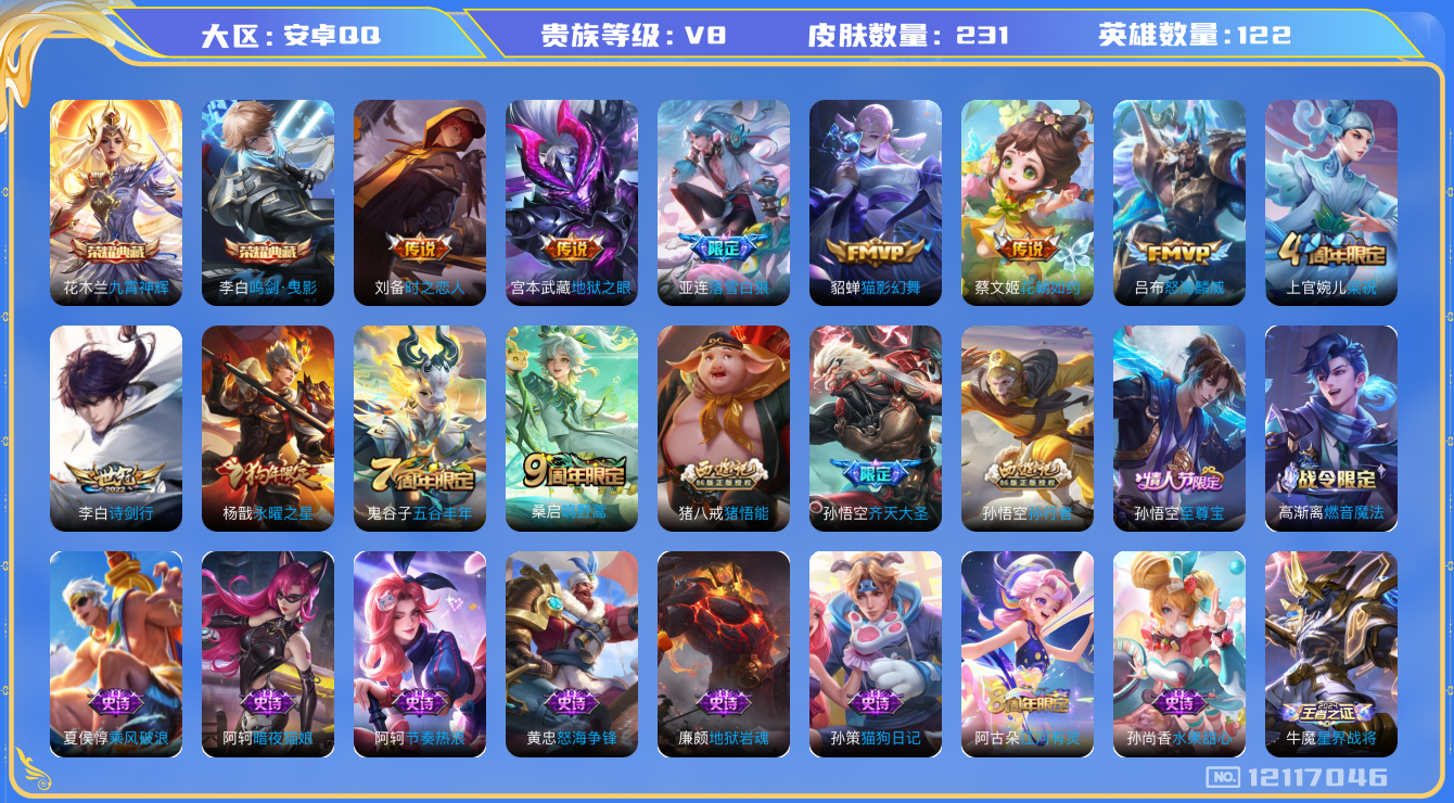 [12117046]V8 2典藏 11传说 122英雄 231皮肤 可修改实名 优质装备:鸣剑·曳影,九霄神辉(木兰典藏),猫影幻舞,地狱之眼,时之恋人-刘备(电焊工),花朝如约(花篮子) 传说皮:落雪白狼 珍宝阁皮:蔷薇恋人 限定皮:鸣野蒿,至尊宝,诗剑行,齐天大圣,怒海麟威,五谷丰年,梁祝,永曜之星,孙行者,猪悟能 史诗皮:星界战将,怒海争锋,决胜骁骑,蔬乡物语(鲁班七号),遇见神鹿,黄金分割率,特工魅影,冰冠公主,江河有灵,高渐离燃音魔法,蒙恬荣光圣徽,晚萤,偶像歌手,暗夜猫娘,末日机甲-吕布,猫狗日记-孙策,节奏热浪,水果甜心,天才门将,心灵骇客,暗隐猎兽者,鬼剑武藏,心灵战警,地狱岩魂,乘风破浪,水晶猎龙者,金属风暴,原初追逐者,鹰眼统帅,暗夜贵公子,魅力维加斯,无心