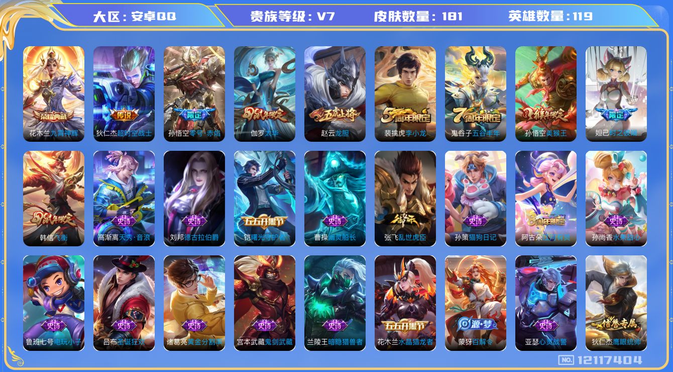 [12117404]V7 1典藏 3传说 119英雄 181皮肤 可修改实名 优质装备:九霄神辉(木兰典藏),零号·赤焰,超时空战士-狄仁杰 珍宝阁皮:女武神 限定皮:太华(伽罗年限),时之彼端,飞衡(韩信年限),五谷丰年,龙胆,李小龙,美猴王 史诗皮:决胜骁骑,电玩小子(小书包),黄金分割率,特工魅影,江河有灵,百解令(蒙犽),蒙恬荣光圣徽,龙骑士(小龙虾),猫狗日记-孙策,乱世虎臣,女仆咖啡,水果甜心,德古拉伯爵,暗隐猎兽者,幽灵船长,鬼剑武藏,心灵战警,拒霜思,水晶猎龙者,曙光守护者,热力回旋,金属风暴,圣诞狂欢,鹰眼统帅,天秀·音浪
