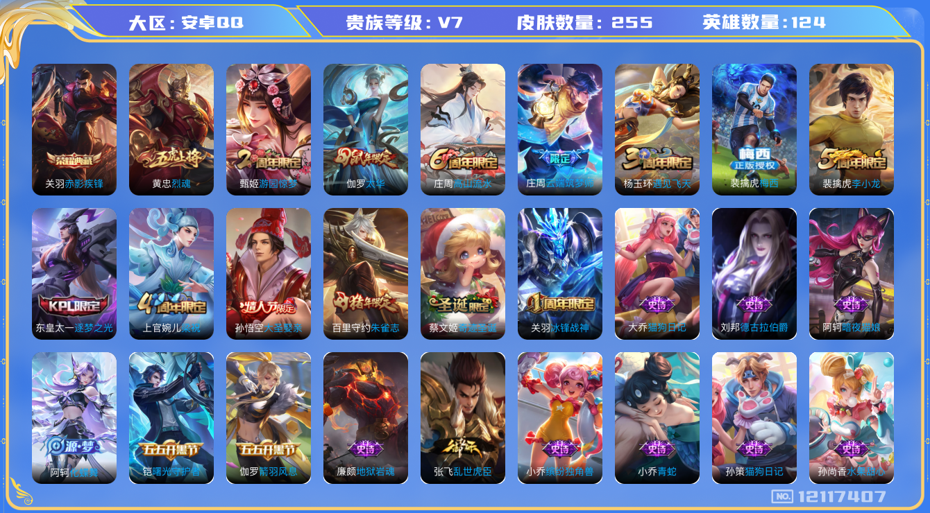 [12117407]V7 1典藏 1传说 124英雄 255皮肤 可修改实名 优质装备:赤影疾锋,涂山容容 珍宝阁皮:蔷薇恋人 限定皮:太华(伽罗年限),梅西,遇见飞天,高山流水,冰锋战神,游园惊梦,梁祝,烈魂,李小龙,逐梦之光,朱雀志(守约年限),奇迹圣诞,大圣娶亲,云端筑梦师 史诗皮:鸭鸭历险记-刘禅,化蝶舞,百相守梦-周瑜,蔬乡物语(鲁班七号),紫霞仙子,电玩小子(小书包),千年之狐,魅语,冰冠公主,青蛇,偶像歌手,暗夜猫娘,猫狗日记-孙策,猫狗日记-大乔,乱世虎臣,女仆咖啡,摇滚巨星,水果甜心,天才门将,星夜王子,德古拉伯爵,暗隐猎兽者,鬼剑武藏,心灵战警,地狱岩魂,繁星吟游(呼啦呼啦),缤纷独角兽,逐浪之夏,水晶猎龙者,曙光守护者,箭羽风息,金属风暴,原初追逐者,圣诞狂欢,圣诞恋歌,鹰眼统帅,暗夜贵公子,魅力维加斯,黎明之约,未来纪元-赵云